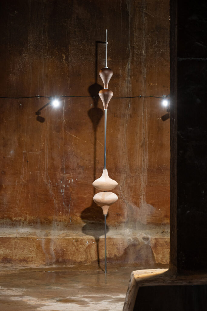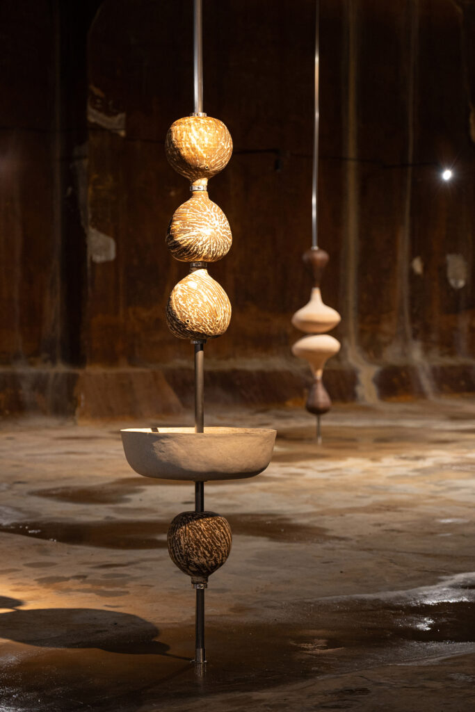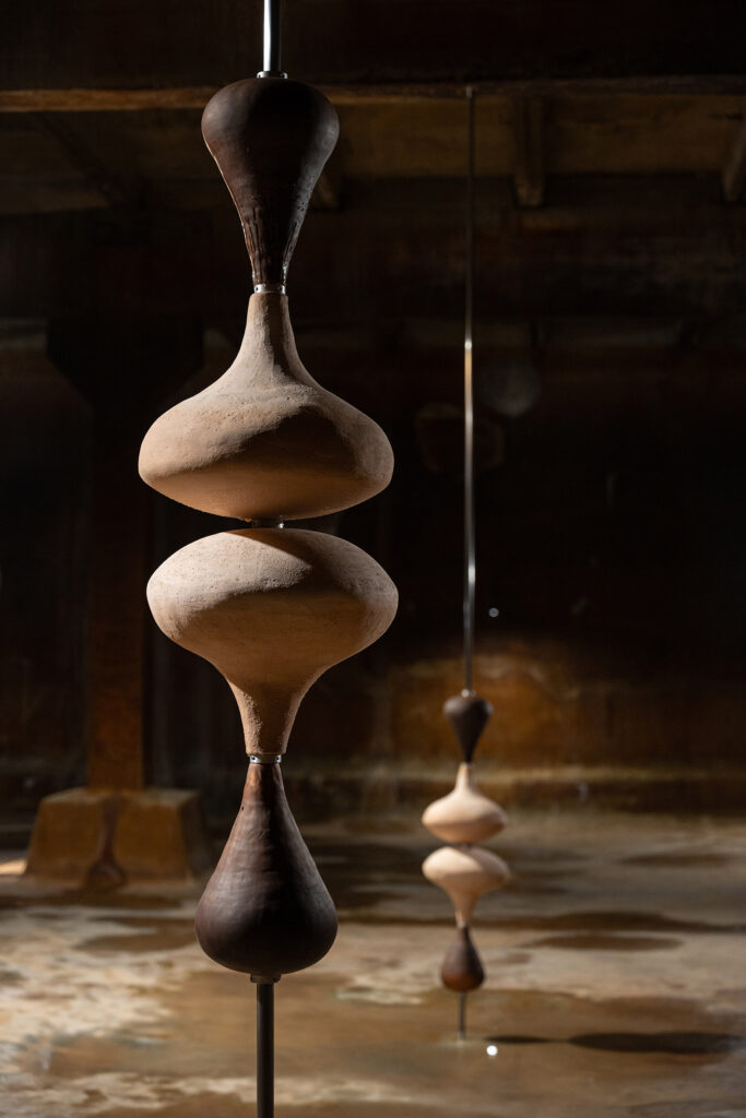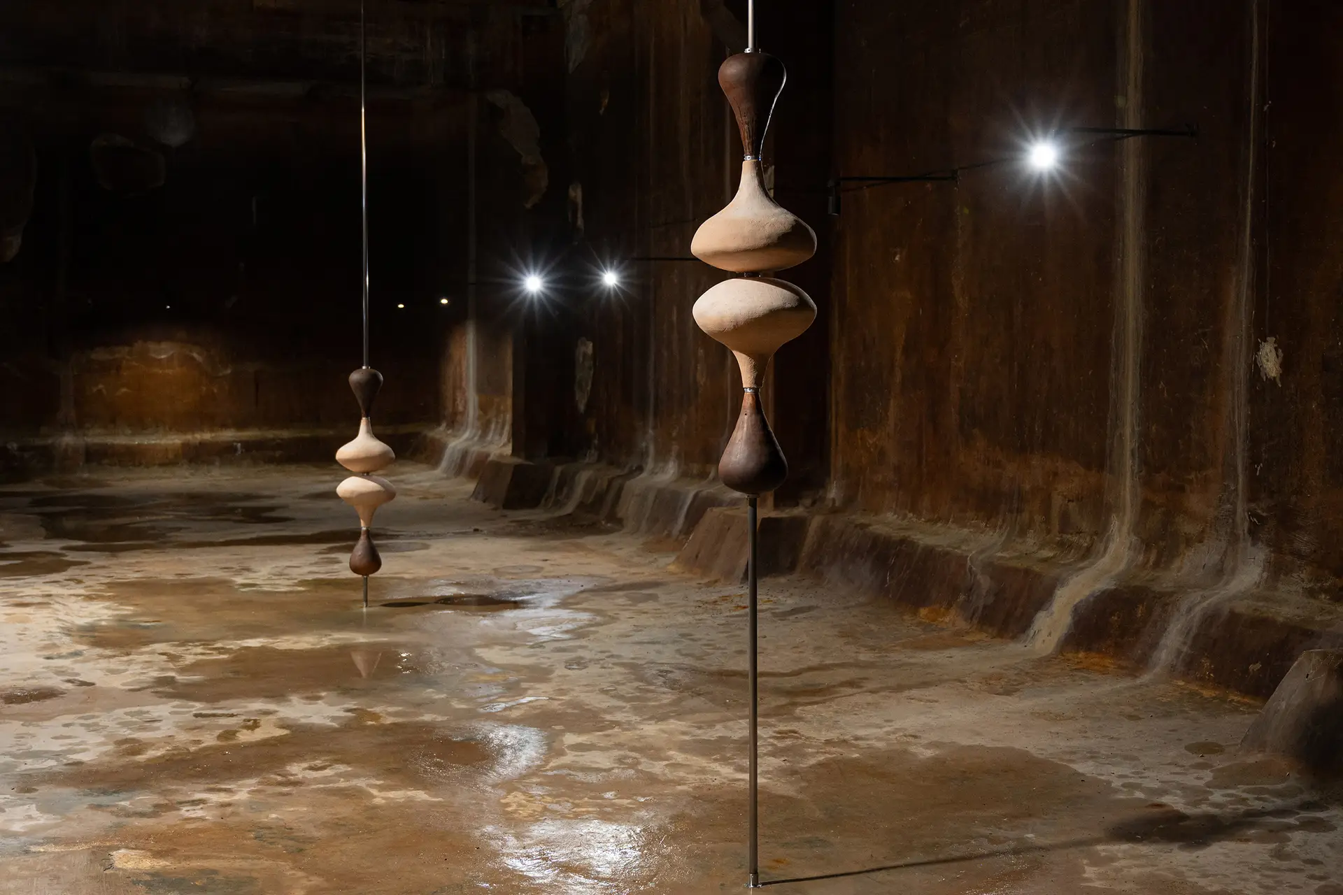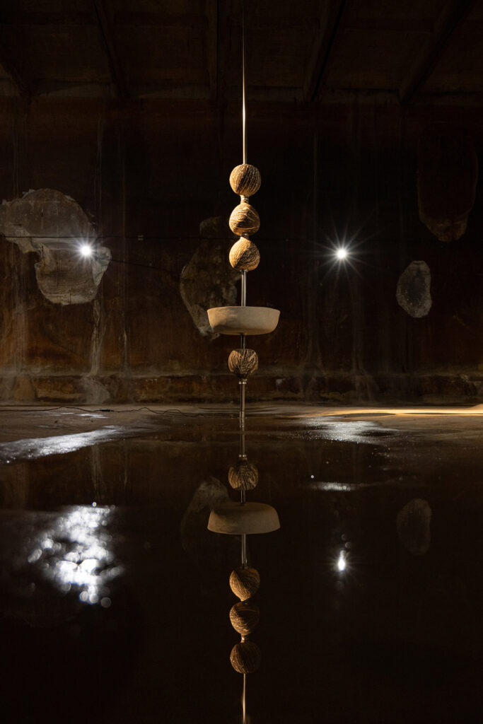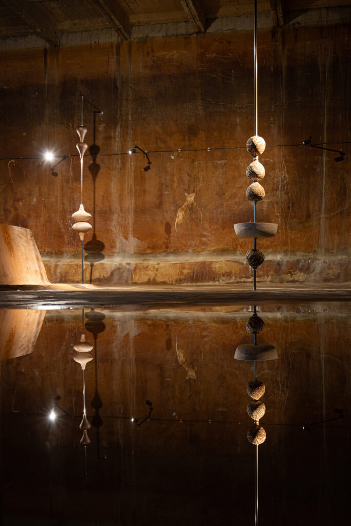 In Flowing Bodies, Janus examines the porosity and permeability of matter through a site-specific installation at the Panevėžys Underground Water Reservoir. The reservoir is imagined as a vast container, an underground belly where metabolic and chemical processes unfold. Ceramic vessels, created in collaboration with local craftsmen using ancient waterproofing techniques—such as dipping hot clay into sourdough starter or milk before firing—are filled with local wild and domesticated water and acidic liquids that undergo chemical and microbial fermentation, slowly transforming throughout the exhibition. Janus developed the liquid recipes in collaboration with wild local yeasts, bacteria, nearby plants, and reservoir water.