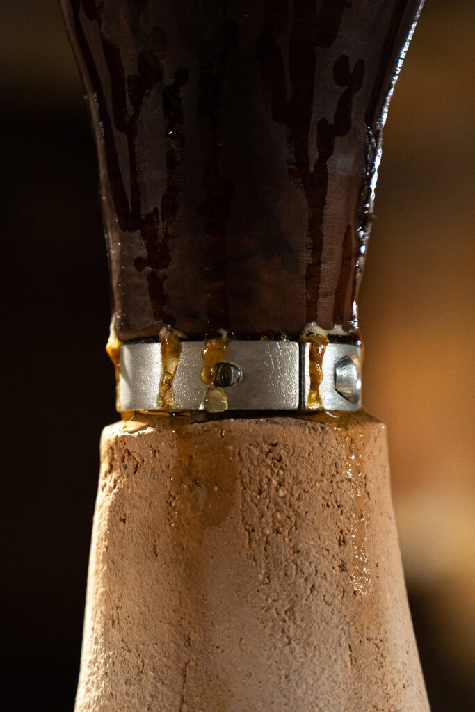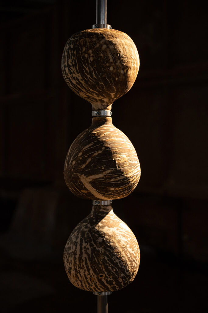 The variations in clay porosity cause the vessels to “sweat” and “cry,” reflecting Janus’s interest in systems that are never closed but open and permeable, through which water carries nutrients, minerals, metals, pollutants, and toxins. By working with traditional vessel shapes in repetitive arrangements, the installation evokes bellies or organ systems: both containers and bodies that hold, yet never fully contain, always seeping, sweating, and dripping.