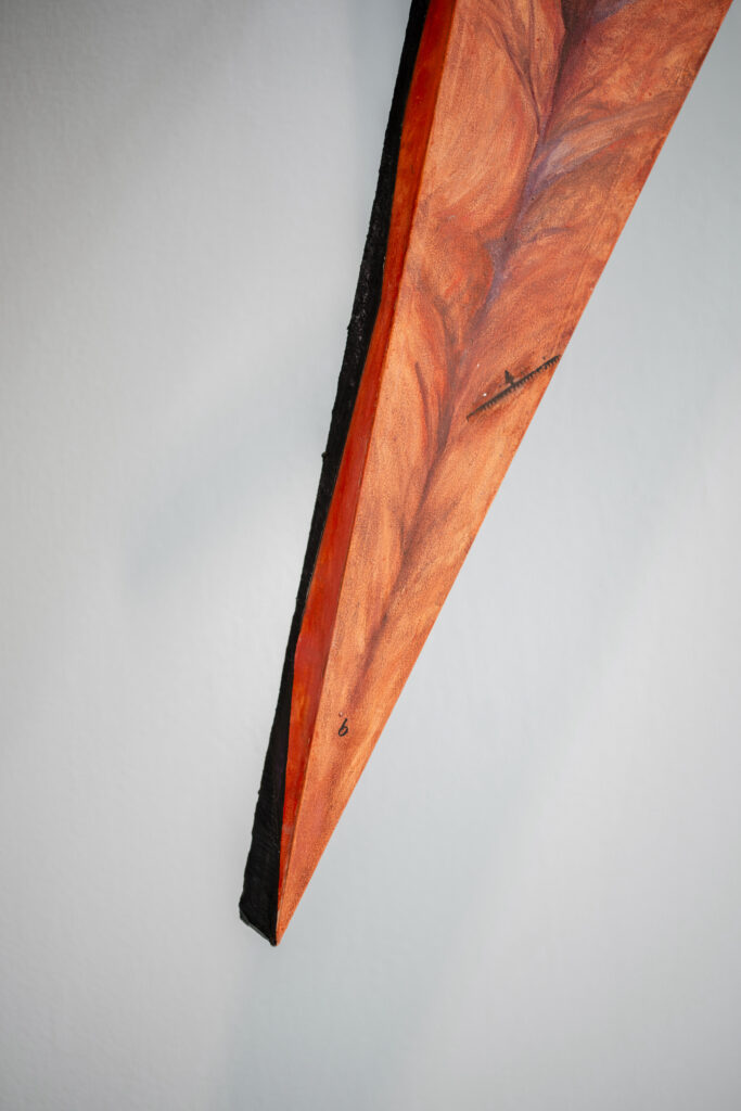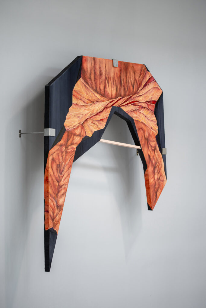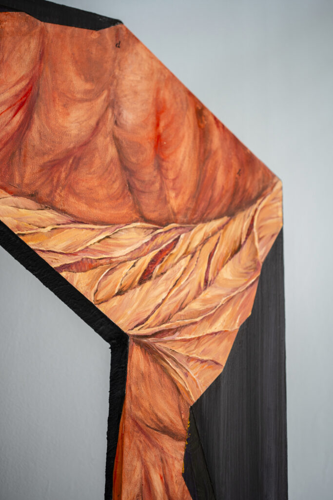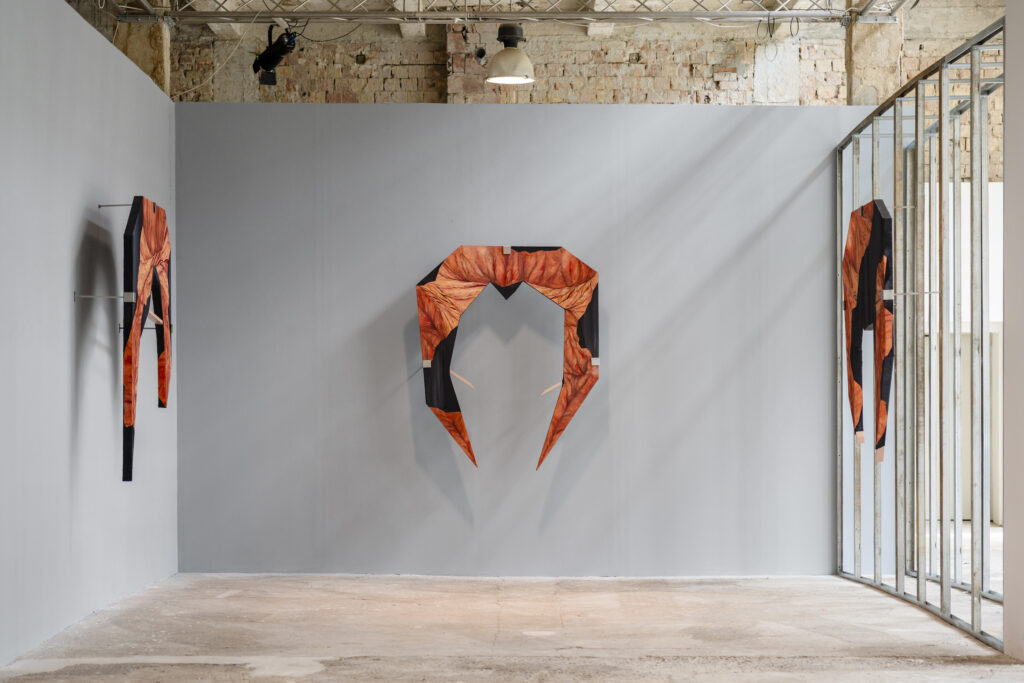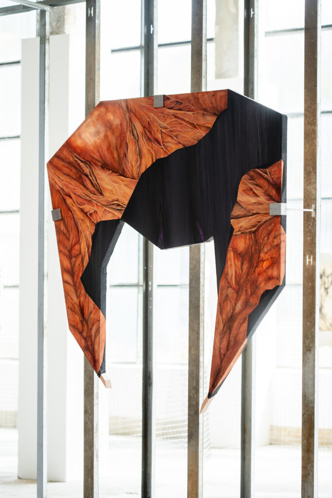 Agg’s primary medium is painting that steps out of the plane into objecthood, highlighting the pictorial turn of the latter half of the 20th century. The first, central group of works, located near the entrance, is Idol I–III. These three large-scale paintings appear as fetish objects of power in the form of “idols,” simultaneously representing the fear, attraction, and reverence that characterize our relationship to images, shifting between aggressive and fragile formal and visual structures. The works evoke classic symbols of power, such as the headdress or horns. By revealing their wooden structures, through shifts in compositional form and chance cropping, the series interprets the picture as construction. Their surfaces draw upon landscapes, maps, architectural plans, and medical imaging scans. Understanding these works requires a complex mode of reading, compelling the viewer to move beyond superficial reception or passive contemplation and to actively analyze the images. In doing so, the viewer recognizes paradoxical situations in which they become victims of pictorial manipulation despite being fully aware of their own misdirection. Following the central group both formally and conceptually are two polarized works—Idol: Moult and Idol: Reconfiguration—representing the dialectics of destruction and renewal.