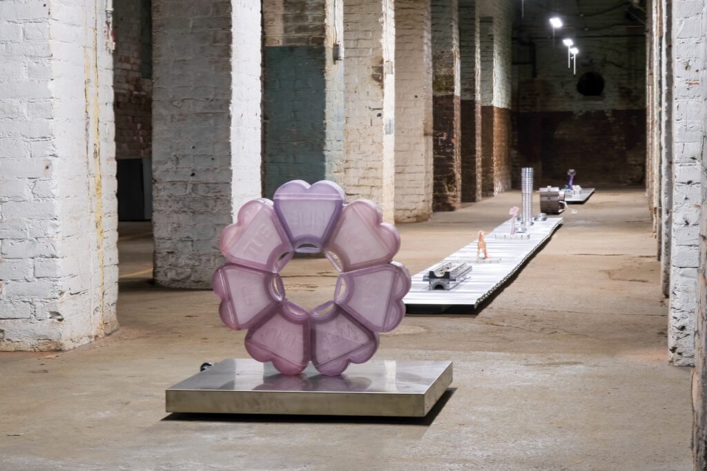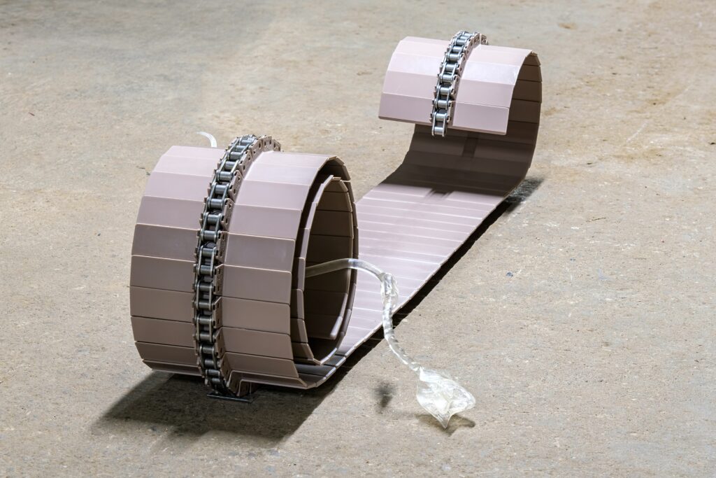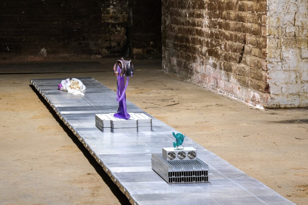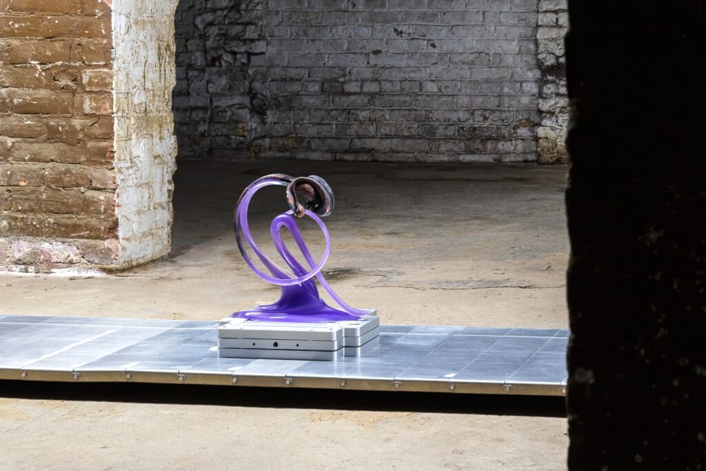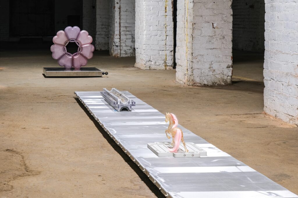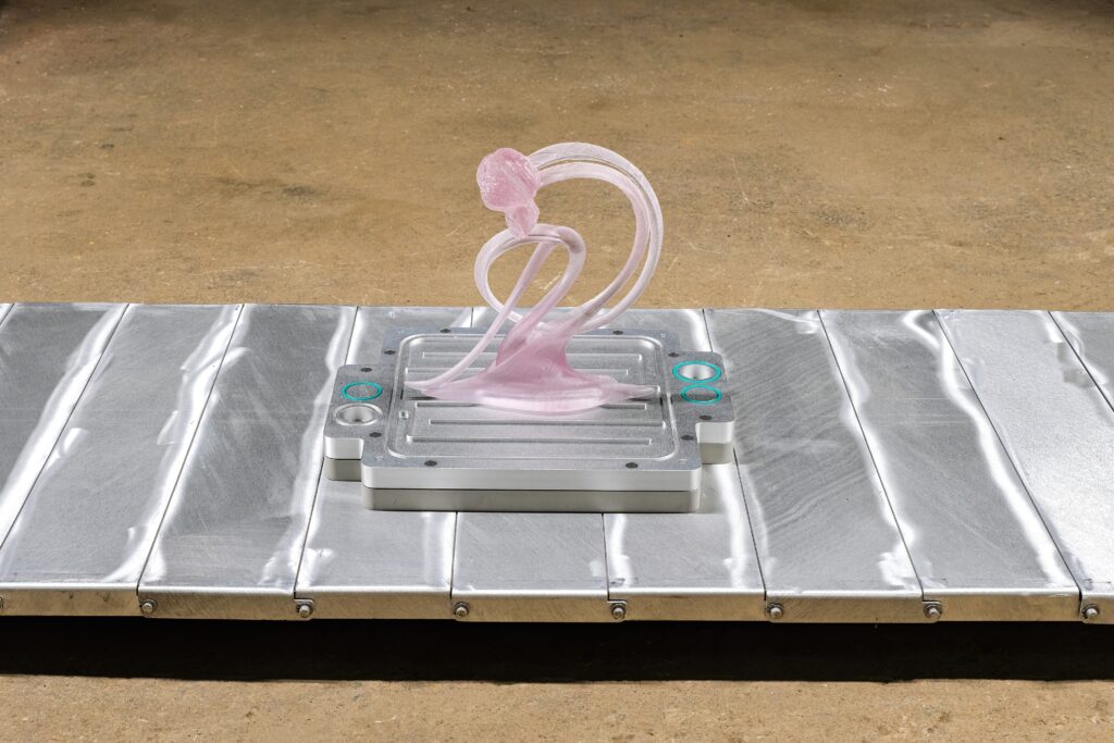 The works combine Bolla’s delicate, 3D-printed resin sculptures–themselves a beguiling hybrid of floral architectures and human viscera– with materials foraged from local antique fairs and surplus industrial components sourced from a nearby clean-technology startup.