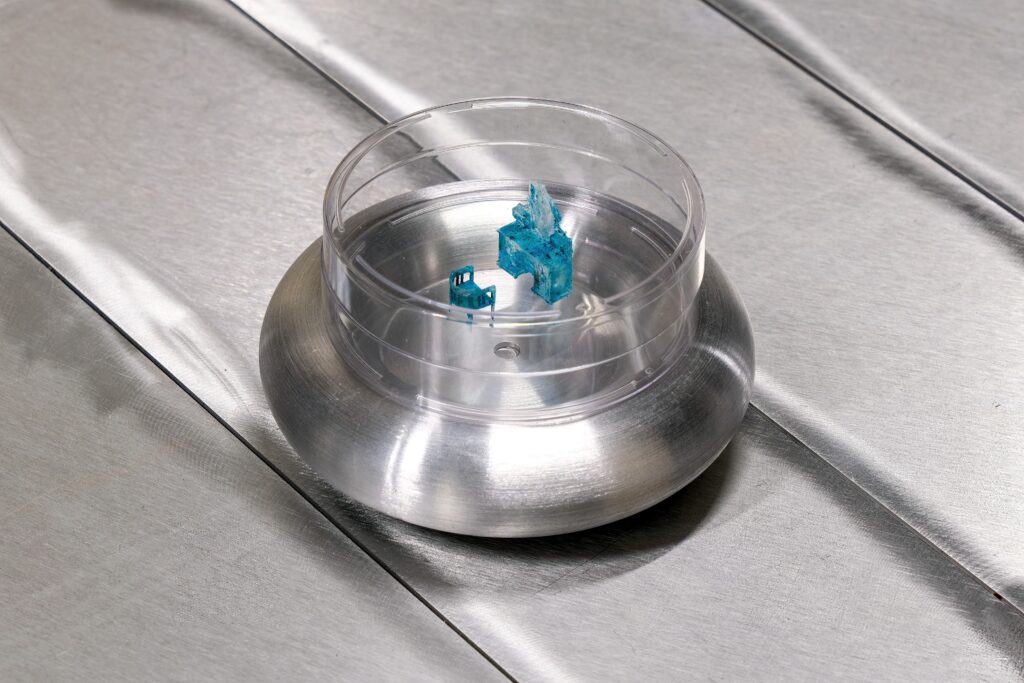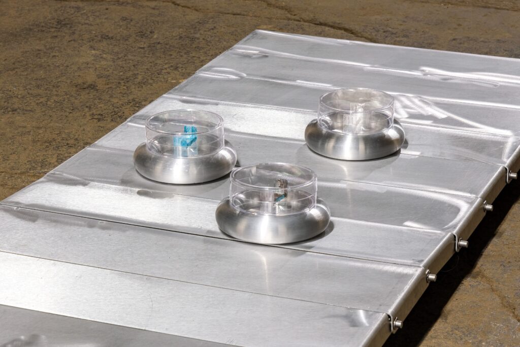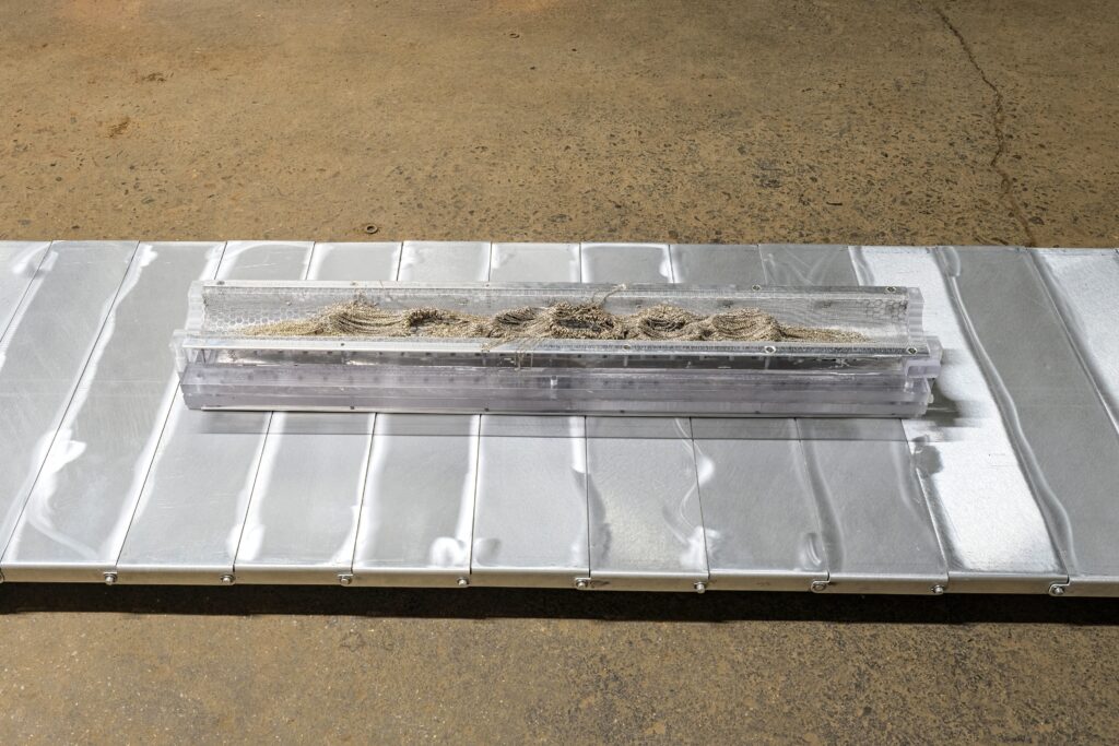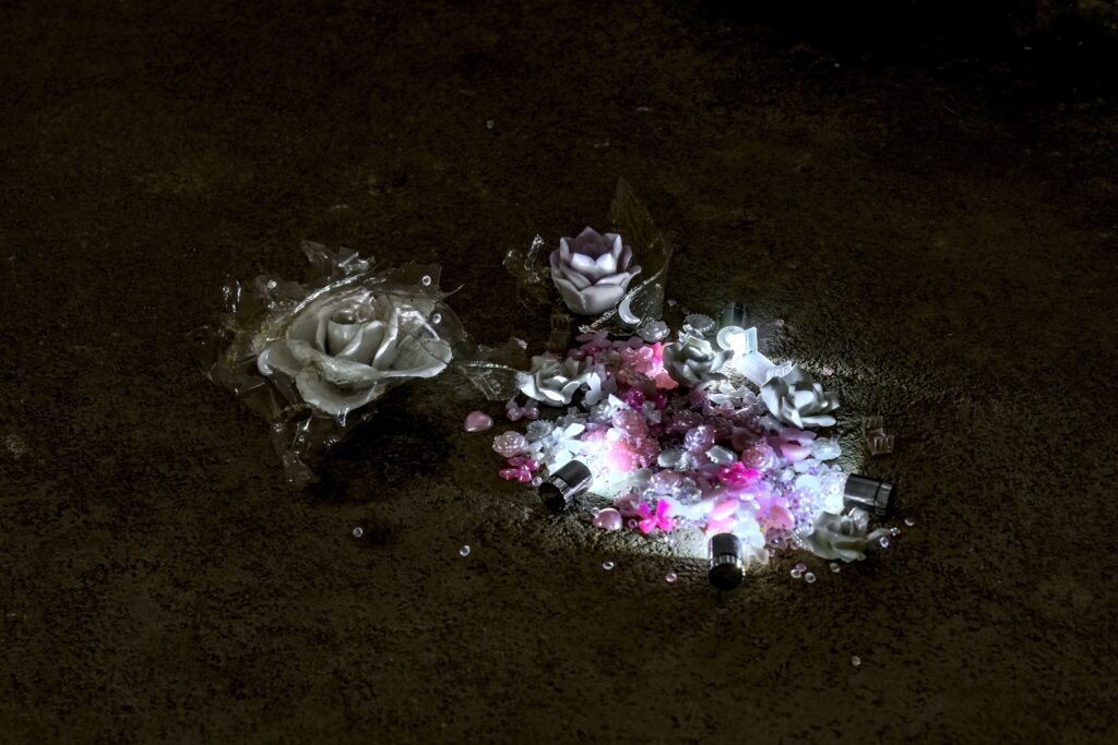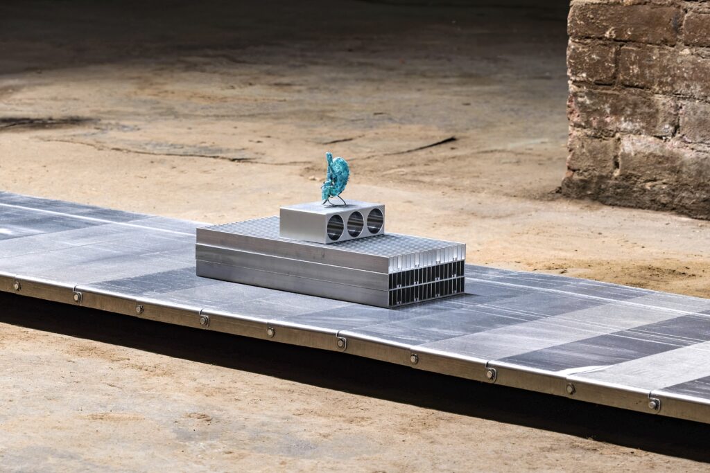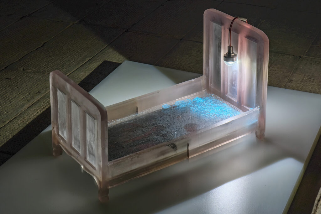 The works combine Bolla’s delicate, 3D-printed resin sculptures–themselves a beguiling hybrid of floral architectures and human viscera– with materials foraged from local antique fairs and surplus industrial components sourced from a nearby clean-technology startup.