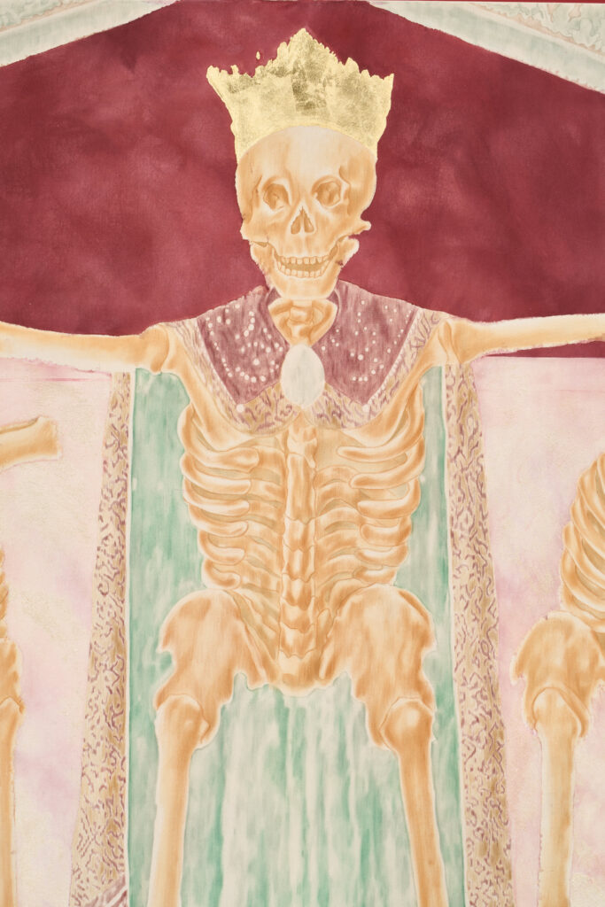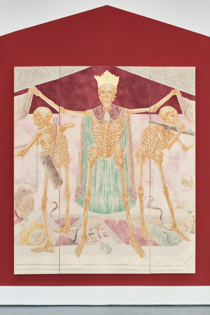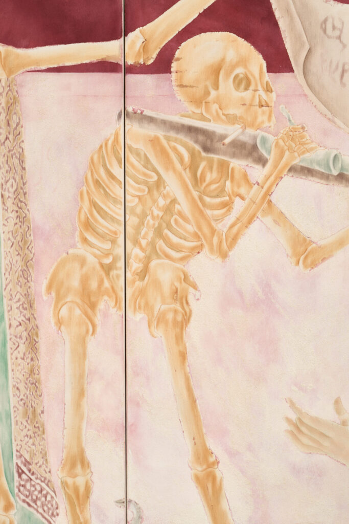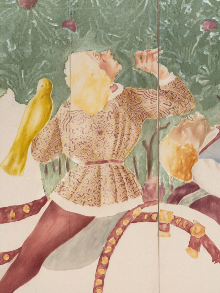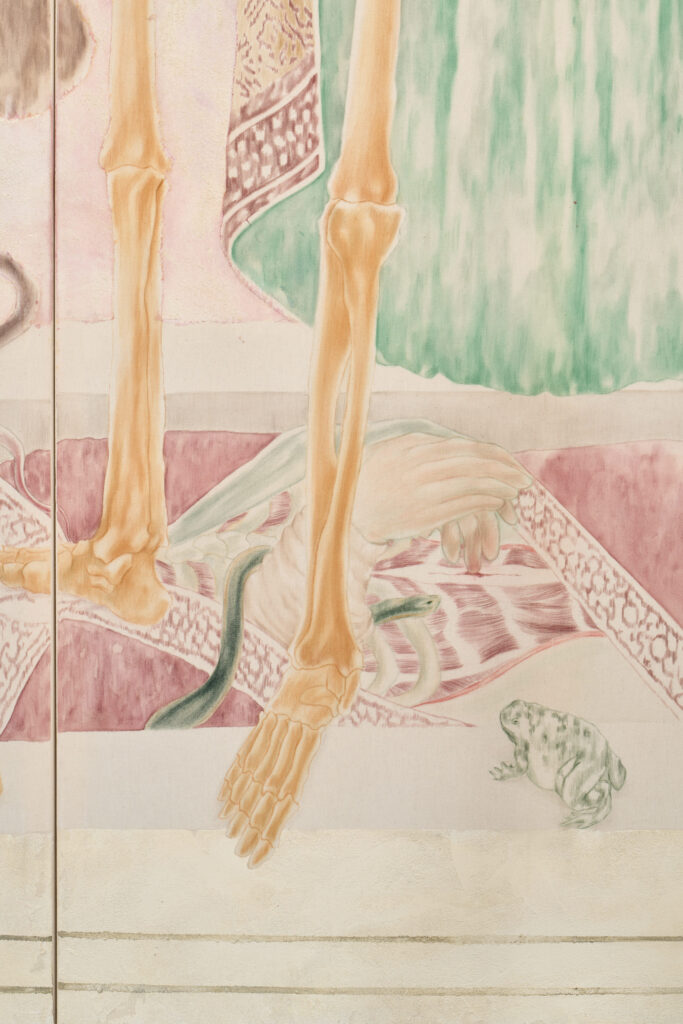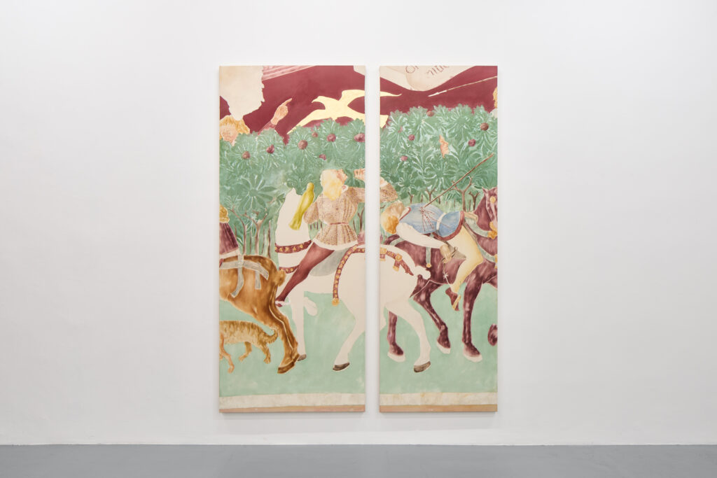 The Food of Life triptych deliberately resembles a restored Italian fresco. The artists achieve this effect by first sewing together different parts of the canvas, then layering acrylic, watercolor, pastels, and sand gesso, and finally removing these layers with sandpaper. Similar to the restoration of wall paintings, we find places on Øleg&Kaśka’s canvas that disappear and reappear, almost as if they were breathing pores or permeable fabric emphasizing the tension between history and memory and their possible manipulation. From the soil loosened by the remains of all that was, there emerges not a funeral disorder but a hermetic pool of knowledge that the soil was, is, and will be one of the sources of life. Contrary to custom, the authors thus place the end right at the beginning.