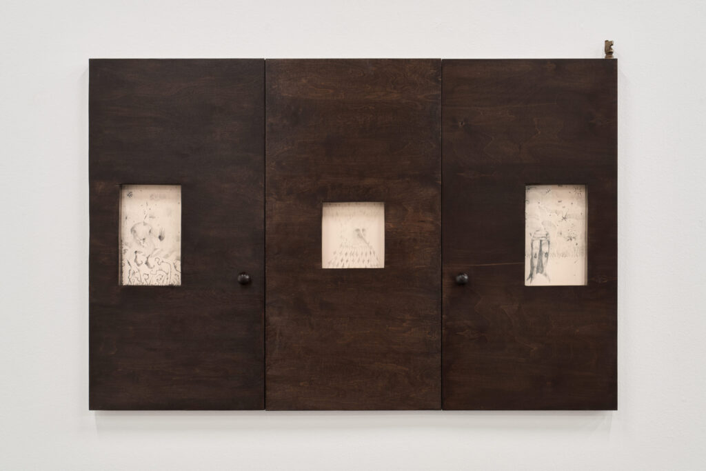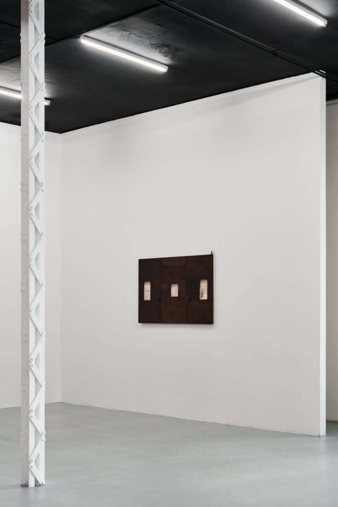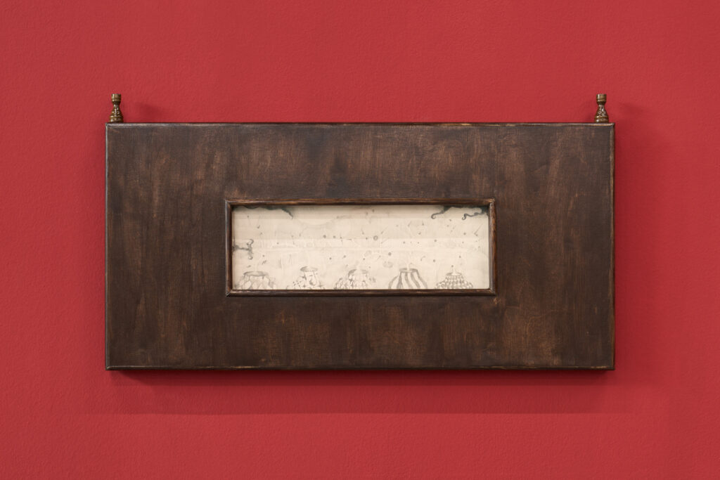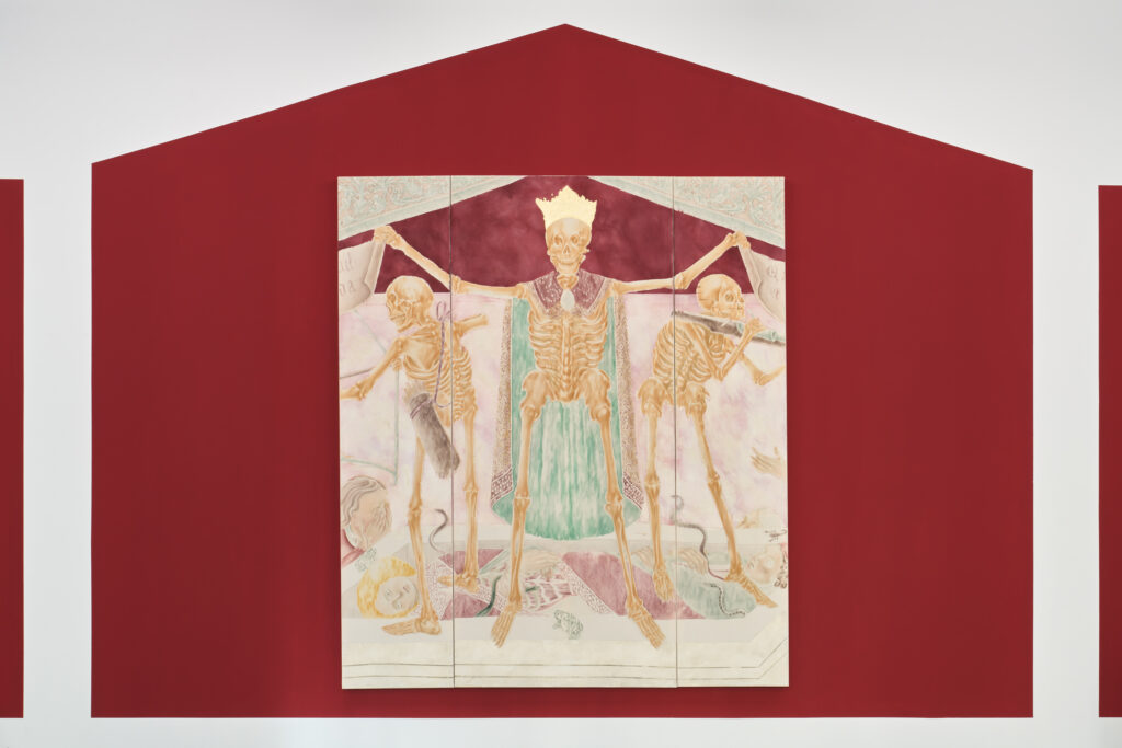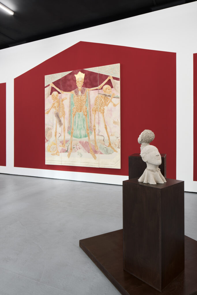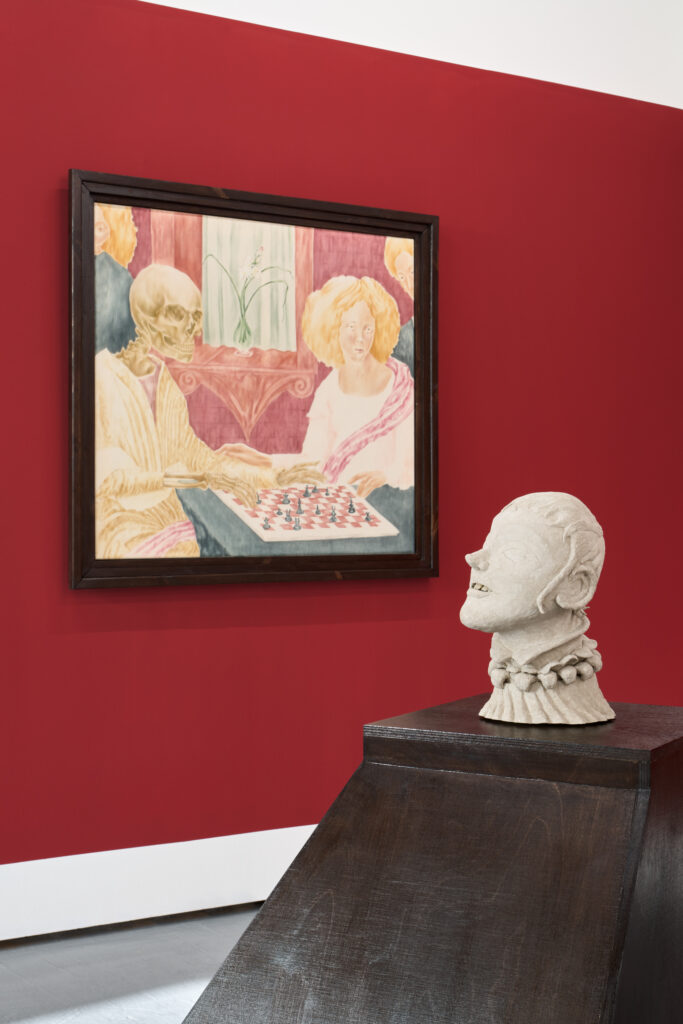 The authors refer to traditional paradigms – the position of human beings above nature, the idea of linear development, and the hierarchical structure of society – in their other works as well. The diptych The Dew of Night depicts a hunting scene. The azure sky, saturated with the “food of life,” is replaced by a murmuring omen, which makes itself known through the spears of rays that descend from it and, already in their transformed form, spill the blood from the squire’s torso with well-aimed blows. The theme of court life and its political intrigues is further developed through sculptures of heads, inspired by the so-called Wawel Heads (circa 1535) by Sebastian Tauerbach, which, although silent, still gaze down from the coffered ceiling on the events in the Throne Room of the Royal Castle in Krakow. Whether they were allegories or astrological symbols, they can be considered portraits of representatives of various classes and social groups, whose significance the artists shift from the role of powerless witnesses to that of direct participants in events, now with their gaze raised. The third canvas in the exhibition, Chess Player, an allusion to Albert Pictor’s medieval painting Death Playing Chess (1480), connects the immortal and his bones with chess games, whose design is also reflected in the artist’s frames of the drawings. All of this comes together here in a clear message – a reminder of events and structural struggles that are repeated regardless of the passage of time and experience gained.