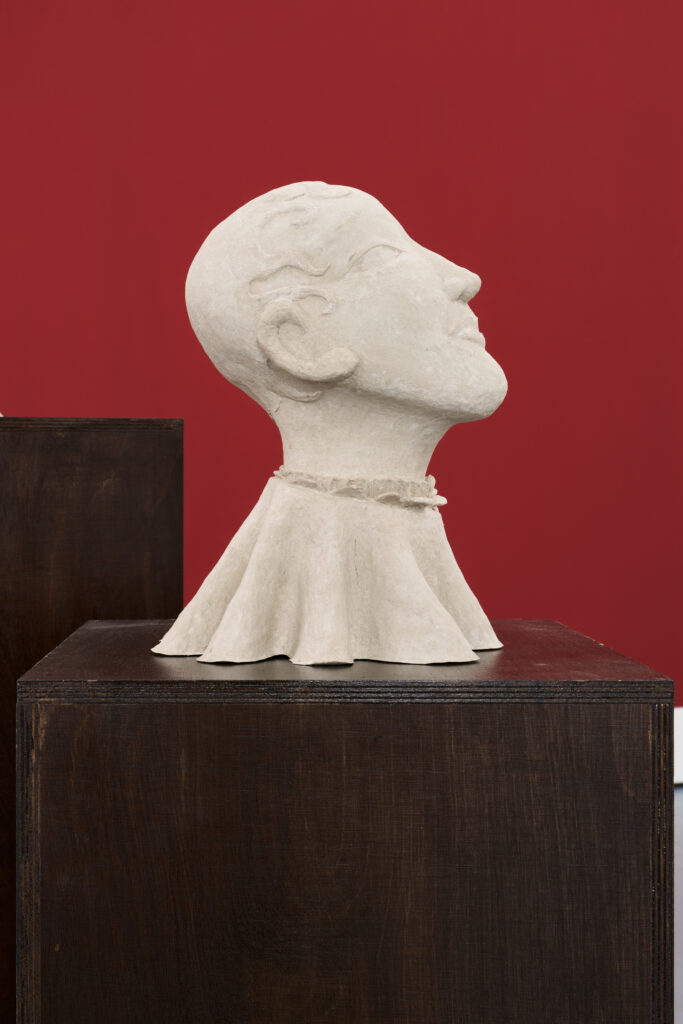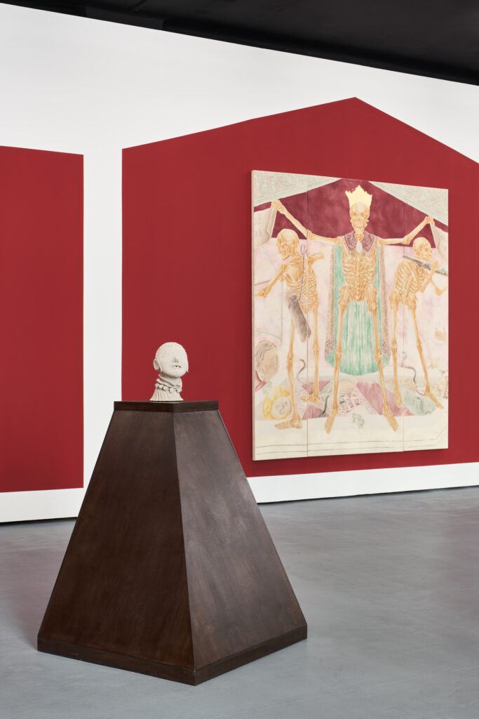 Øleg&Kaśka borrow the idea of “food of life” for their macabre exhibition at the Polansky Gallery, in which they take a playful approach to the dynamics of human life. Against the backdrop of a warm, brown-red banquet hall, they present their paintings and authorially adjusted drawings, as well as papier mâché busts. Unlike the linear principle of memento mori, which encourages reflection on the transience and finitude of earthly joys, Øleg&Kaśka reflect more on the cyclical nature of all living things in the concept of eternal return by Romanian philosopher Mircea Eliade. His distinction between profane time and sacred time points to the role of myth. Myth is not just a story of the past, but an active way in which individuals or societies organize their relationship to the present. Myth allows us to reconnect with sacred time through archetypal events and free ourselves from the anxiety of the irreversibility of the passing of time. The gradual awakening (similar to the burial of winter or New Year’s celebrations) is reflected in the exhibition not only in the choice of themes, but also in their formal handling.