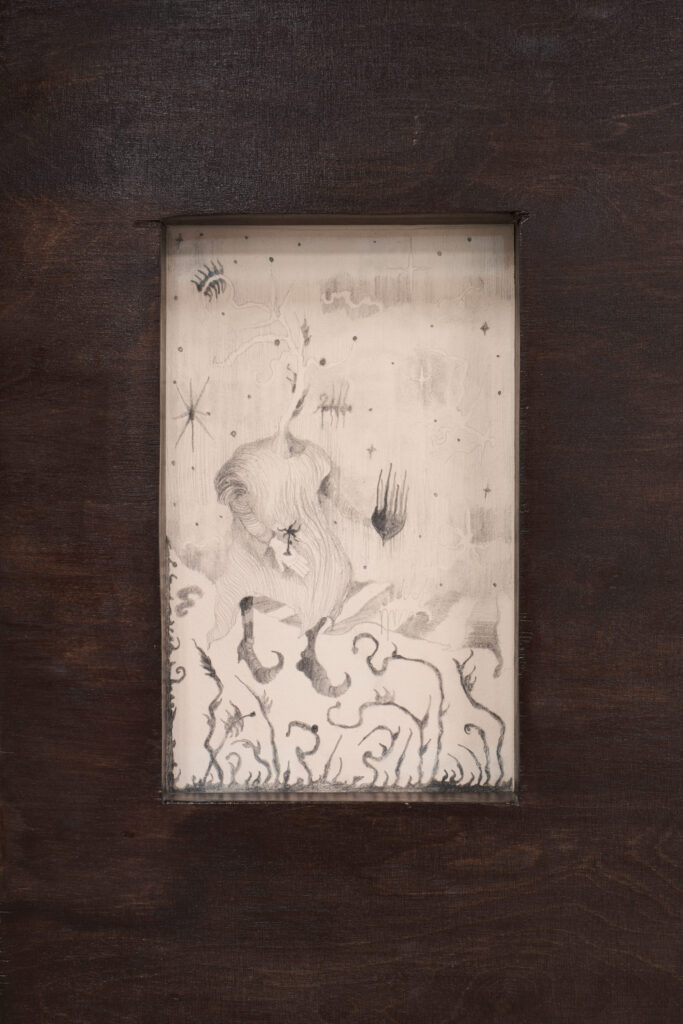 The return of the dead is a common theme in works of art. In his magical realist novel One Hundred Years of Solitude, Gabriel García Márquez refers to memory and the cyclical nature of individual destinies, as does Nobel Prize winner Olga Tokarczuk. For Tokarczuk, however, this leads to something else – a sensitivity to connections (from her speech The Tender Narrator, delivered in 2019 when she received the aforementioned award). It is a type of storytelling and perception of the world that is more than just a causal chain of events. For her, this tenderness is a call for a new type of narrator who does not divide the whole into separate parts, but seeks connections through new structures and myths. In her later essay, she concretizes this idea under the term Ognosia – a process that attempts to organize objects, situations, and phenomena into a higher, interdependent meaning. Linear stories or mental models are no longer sufficient to capture the complexity of the contemporary world; it is necessary to take into account the multi-organism network of relationships between all living and non-living things, even if these connections are not yet known to us, in contrast to the traditional model of the isolated “man-narrator-ruler.” Instead of a third-person narrator, we find a panoptic narrator whose mode is pluralistic and expansive. Øleg&Kaśka adopt this perspective when, through their works, they freely flow through time, space, reality, and imagination, reminding us of the mutual permeability between the world around us and the human being itself. They allow us to breathe in the purest essences of the “food of life,” which saturates the air just as Ognosia saturates the environment they have created.