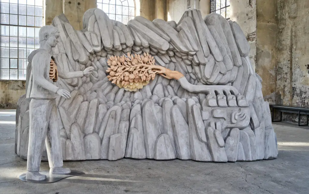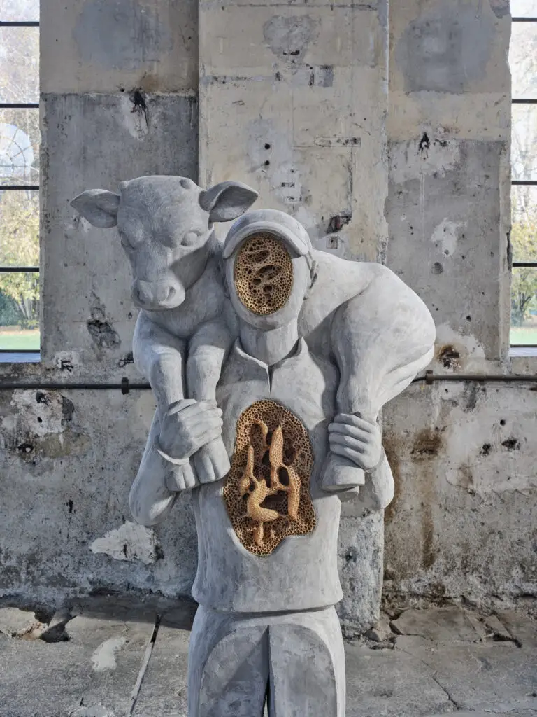In the historic assembly hall at Dornbirn, we are greeted by a bustling scene: people are sowing, weeding and harvesting, taking breaks, operating mysterious tools, carrying a calf, sharing a meal. The figures are human in form and made of concrete, with a mottled grey appearance. Clothing, headgear and hairstyles are roughly contoured. Faces are replaced by ornamental, glossy glazed ceramics or monochrome drawings. Some limbs are unformed: where hands should be doing heavy work, the arms merely taper to a point. In places, honeycombs replace central organs, as in the figure entitled “Calf Bearer” (2025). During the production of the work, the artist placed it in her home garden and her bee colony colonised the empty spaces and gaps in the concrete bodies and floral carving. Thus, in a sense, the sculptural body is reclaimed as a living part of the hive by being incorporated into the bees’ natural building instinct during swarming season. In the ancient concept of “bugonia”, honeycombs represent the mythological symbolism of cyclical renewal and the preservation of life. The sculpture “To Eternity”, a cow’s head lying on its side with honeycombs growing out of its open throat, illustrates this myth: the ancient Greeks and Romans believed that bee colonies were resurrected from the carcasses of animals. The bees connect the realm of the dead with the world of the living, representing the survival of the spirit and, through their contribution to the cycle of nature, ensuring the survival of Earth’s inhabitants.