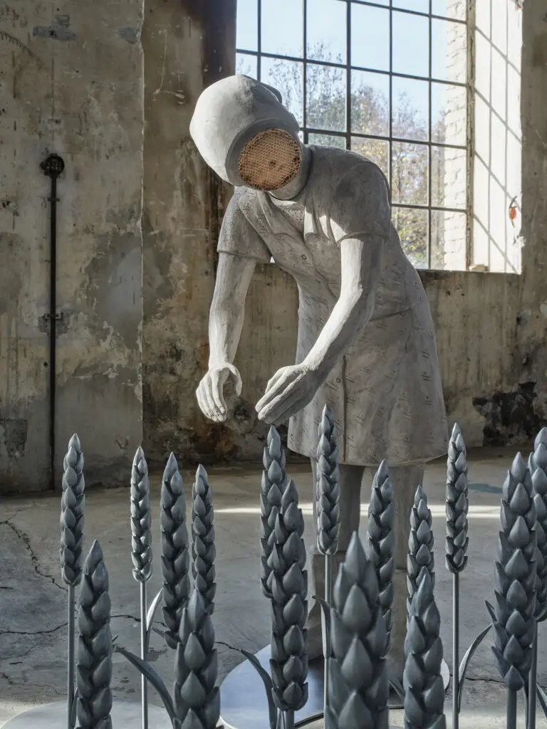 For almost a decade, Hulačová’s interest in these ancient legends has shaped her sculptural work. She brings the narrative into the present by linking it with formal echoes of the stylised and inflated depiction of workers in Socialist Realism, thus weaving together ancient legends, cultural-historical references, and a unique, forward-looking design and material aesthetics in a very exciting way. In the figure of “The man with the Hoe” (2025), the honeycombs in his abdominal cavity are combined with the use of a tiny wooden hoe. In pictorial history, this tool was a medieval emblem of peasant labour in harmony with natural cycles, symbolising harvest, fertility and sustenance. We are here somewhere between everyday realism and heroisation, but the sculpture still clearly refers to hard physical labour conforming to the rules of nature. Through the use of machines that span out a field of tension between work, the body, technological progress and ideology, Hulačová’s sculptures reflect the transition to industrial work. They spell out traditional depictions of agricultural workers: beginning with the medieval use of tools, through the glorification of agriculture workers operating machines in industrialisation, then on to the utopian visions of progress in Socialist Realism, the avant-garde fusion of body and machine, and finally today’s hybrid forms. Hulačová’s work encourages us to reflect critically on industrialised agriculture.