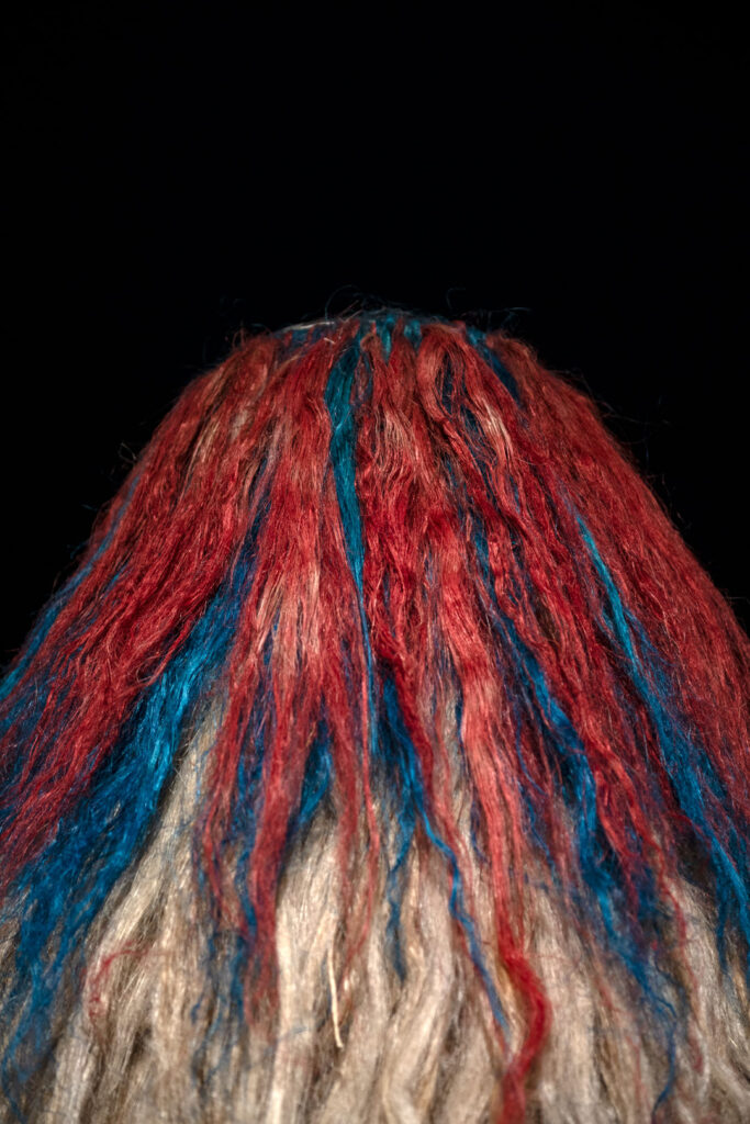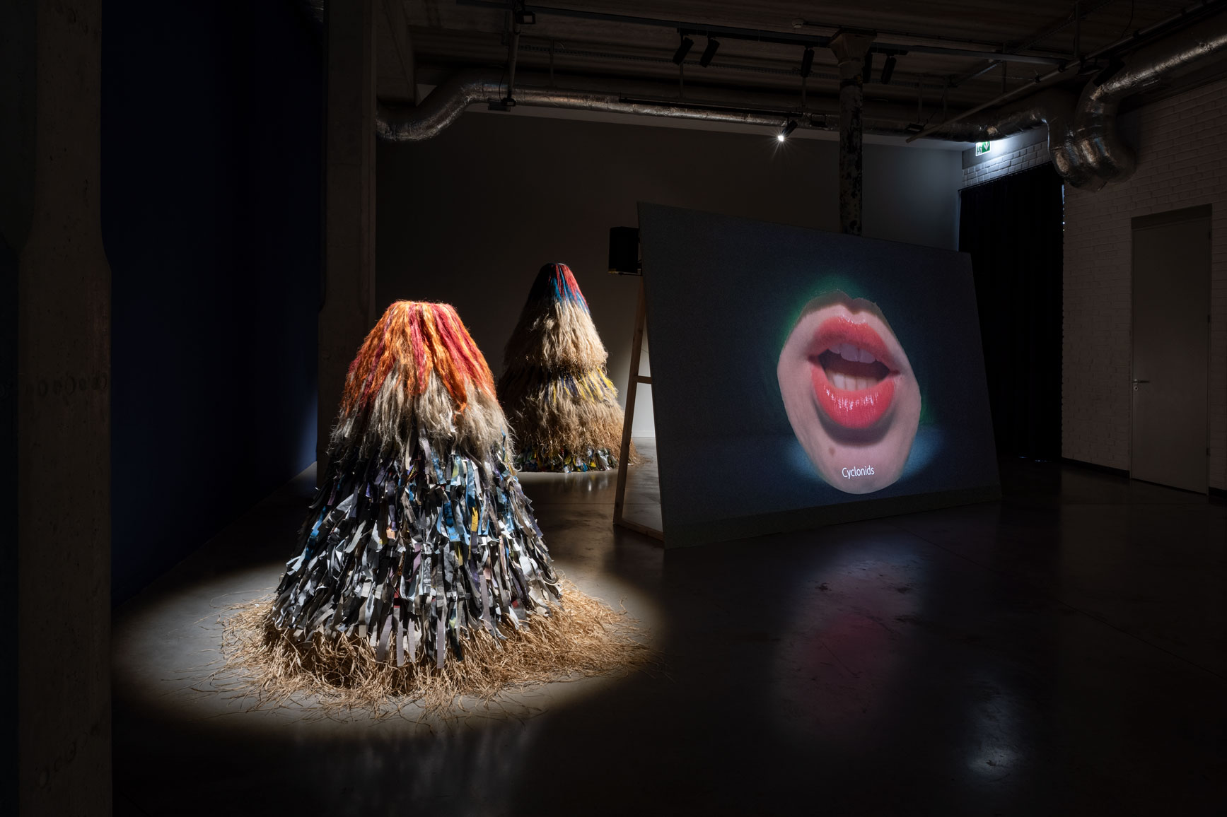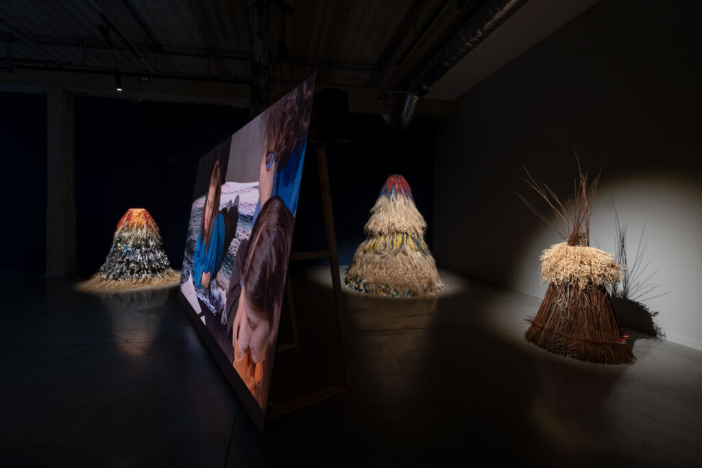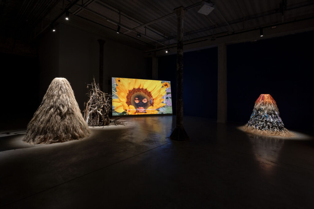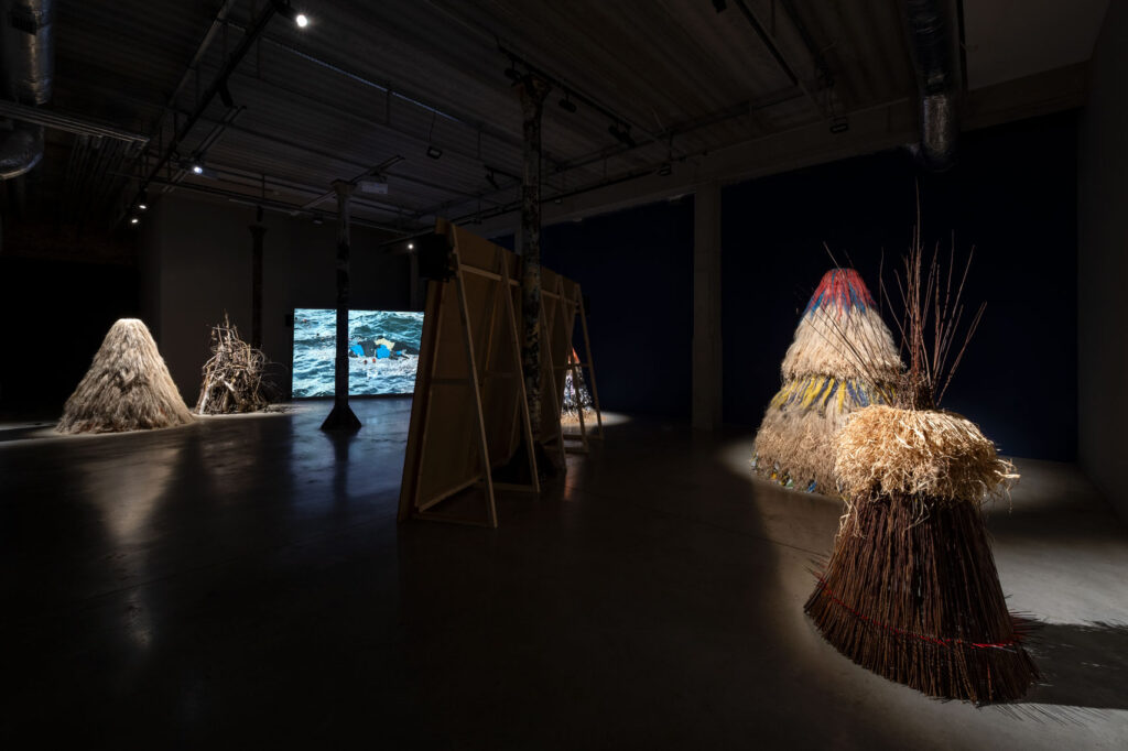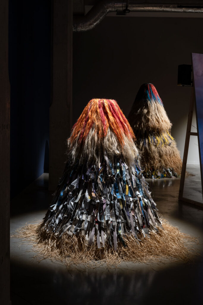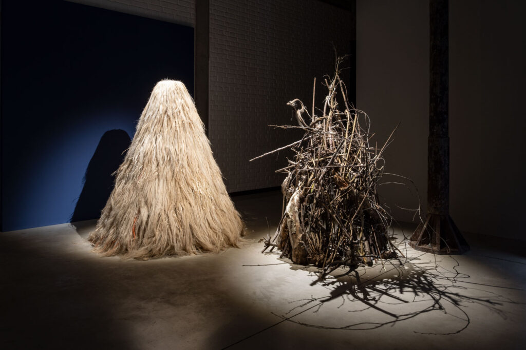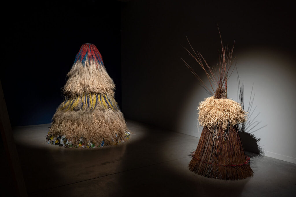 Upon entering the exhibition, the viewer’s gaze is drawn to objects composed of heterogeneous materials. They evoke haystacks, chochoł, or the costumes of Kumpo dancers. Kumpo – a traditional figure in the culture of the Diola people of Senegal and Gambia – is clad in grass and leaves; he dances during festivals, embodying the spirit of the forest or the community. The dancer himself remains unseen, dissolved within the costume. In Polish tradition, a similar shape appears as chochoł – the straw cover placed over living plants during the winter vegetation period. In their material presence, such covers harbour a secret: they conceal what continues to live inside them. Kumpo is also a protective spirit – an emblem of unity and communal support. Within the exhibition, these objects assume the character of hybrid constructions, assembled from disparate materials and emanating the spirits of contemporary hope. They exist in tension between the gesture of the human hand and the autonomy of matter. Mediating between former utilitarian functions and symbolic meanings activated in new contexts, they operate as traces of past practices and possible futures.
