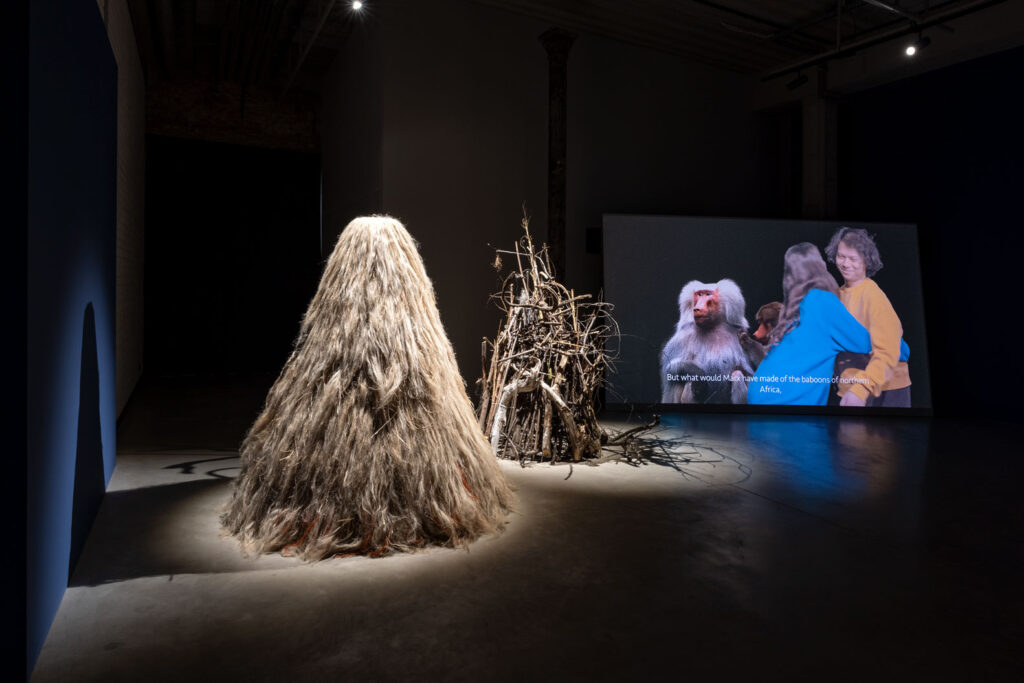 The artist assembles fragments of the world drawn from capitalist ruins – ecological, social, linguistic – revealing that although the system appears monolithic, it is in fact provisional, riddled with cracks, discontinuities, and sites of resistance. This logic is mirrored in her video work, narrated by Bożena Grzyb-Jarodzka: a story of baboons drawn from Fear of the Animal Planet: The Hidden History of Animal Resistanceby Jason Hribal. Regarded by humans as ridiculous or clownish, these animals nevertheless exhibit loyalty and devotion to their young so fierce that they pursue a train carrying a child abducted by humans. They attack trains in order to reclaim their offspring.