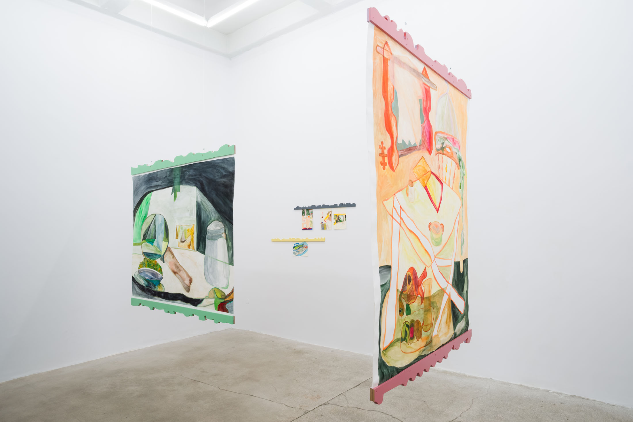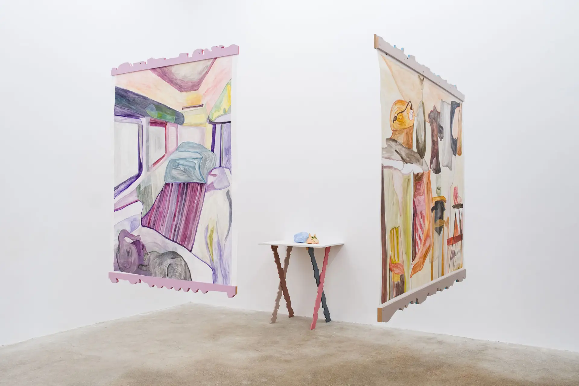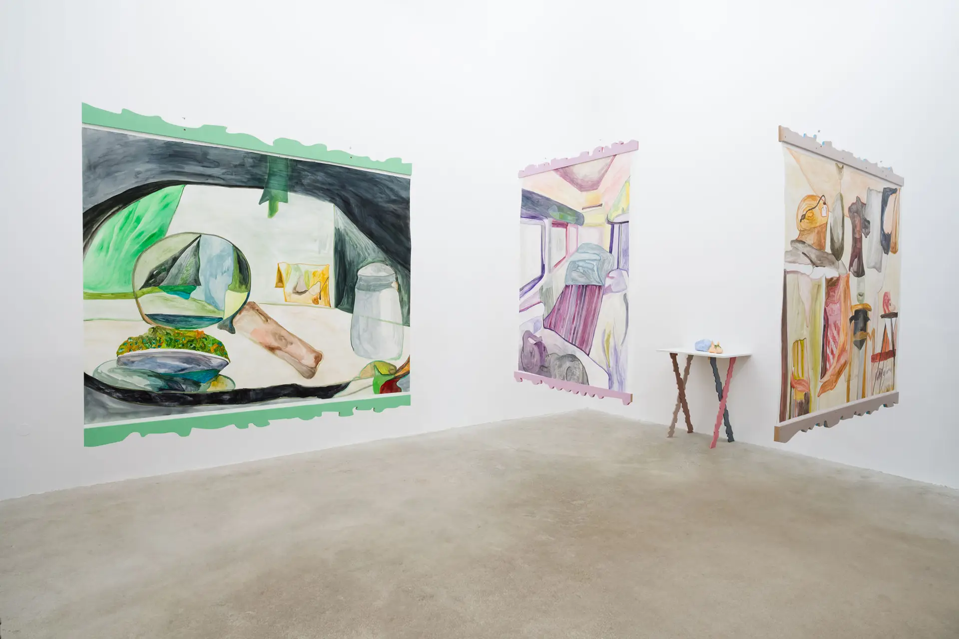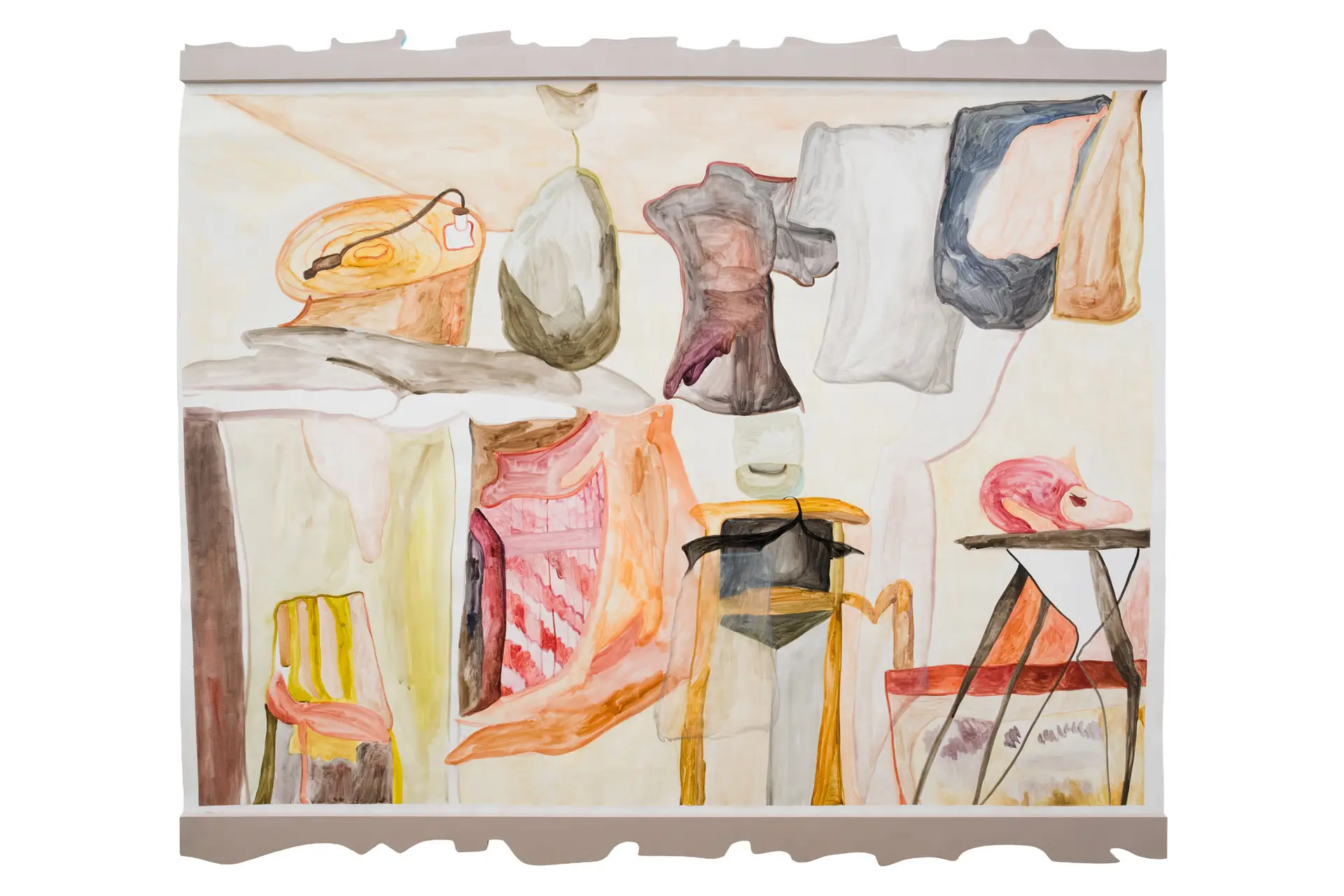 The works in A World Slightly Elsewhere are the outcome of recent explorations into the expressive potential of watercolor and oil pastel on paper, whose inherent and rather charming fragility augments the dynamic immediacy of the pieces. The encounter of these two registers of materiality—watercolor and pastel—one ethereal, the other velvety and unctuous, delineates the framework of a dialogue between the subtleties of evanescence and textural richness. The large-scale works are suspended, detached from the convention of the frame, offering themselves as vulnerable and imposing at the same time. They function as double gates—indeed, portals—granting access to a space-time of imagination, to a “land of mirrors” where everything resembles the known world but is governed by different rules, invented by an Alice who does not flee from reality but reconfigures it, exploring its folds and hidden possibilities.