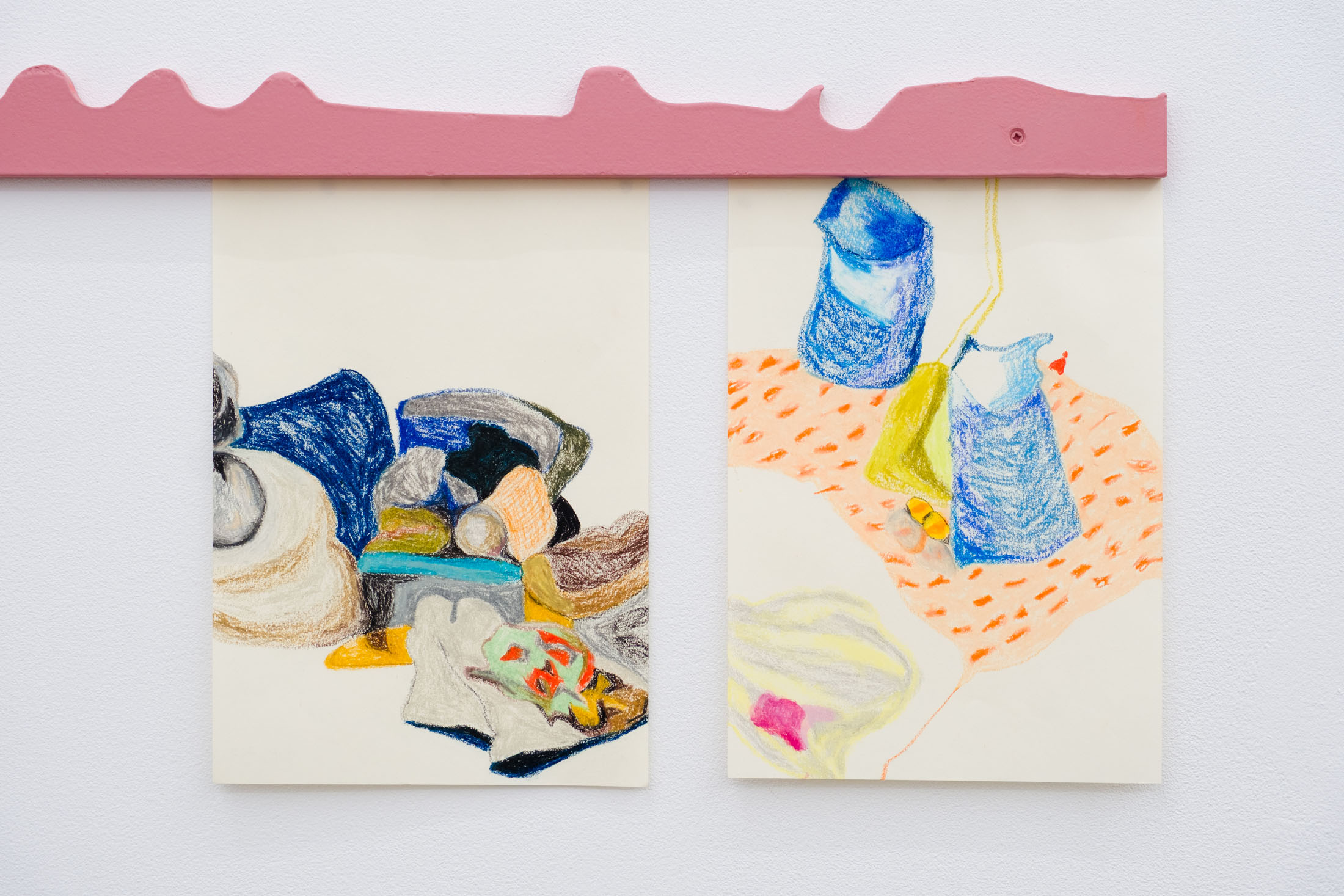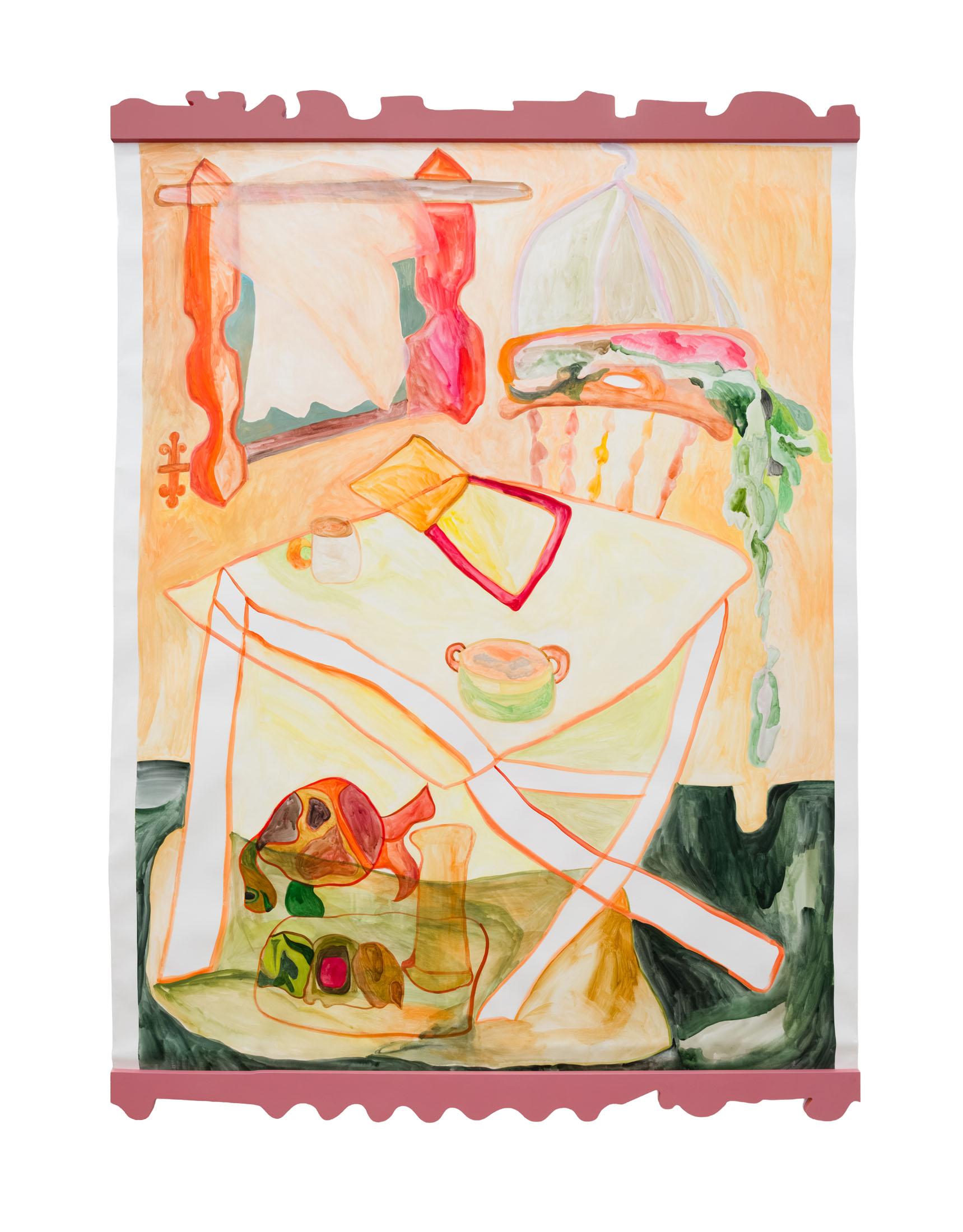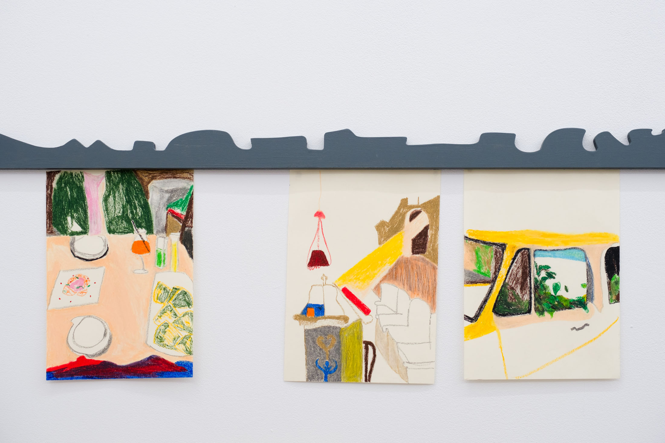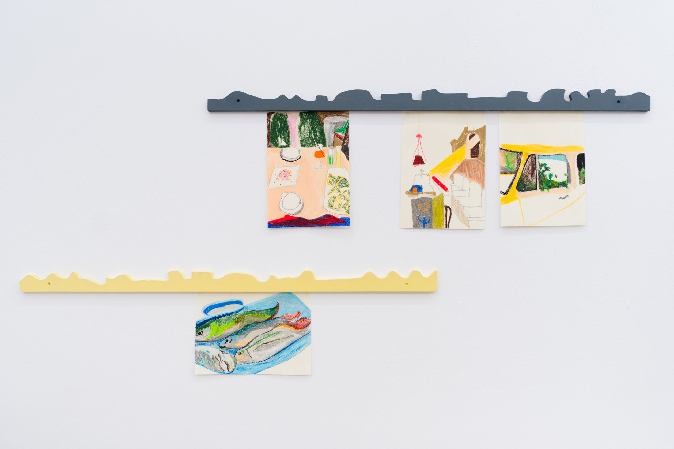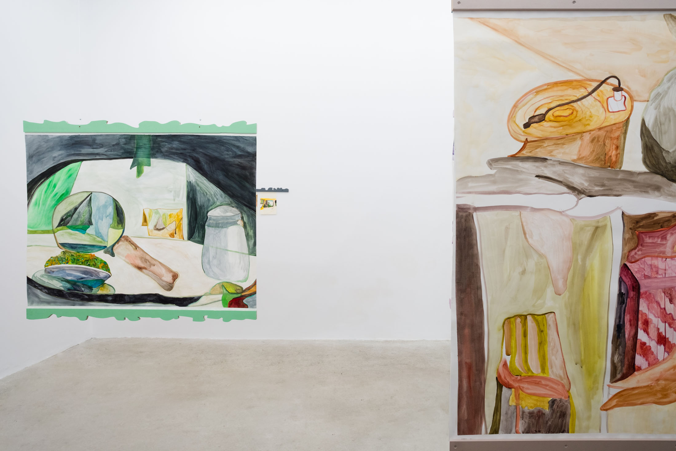 The works in A World Slightly Elsewhere are the outcome of recent explorations into the expressive potential of watercolor and oil pastel on paper, whose inherent and rather charming fragility augments the dynamic immediacy of the pieces. The encounter of these two registers of materiality—watercolor and pastel—one ethereal, the other velvety and unctuous, delineates the framework of a dialogue between the subtleties of evanescence and textural richness. The large-scale works are suspended, detached from the convention of the frame, offering themselves as vulnerable and imposing at the same time. They function as double gates—indeed, portals—granting access to a space-time of imagination, to a “land of mirrors” where everything resembles the known world but is governed by different rules, invented by an Alice who does not flee from reality but reconfigures it, exploring its folds and hidden possibilities.
