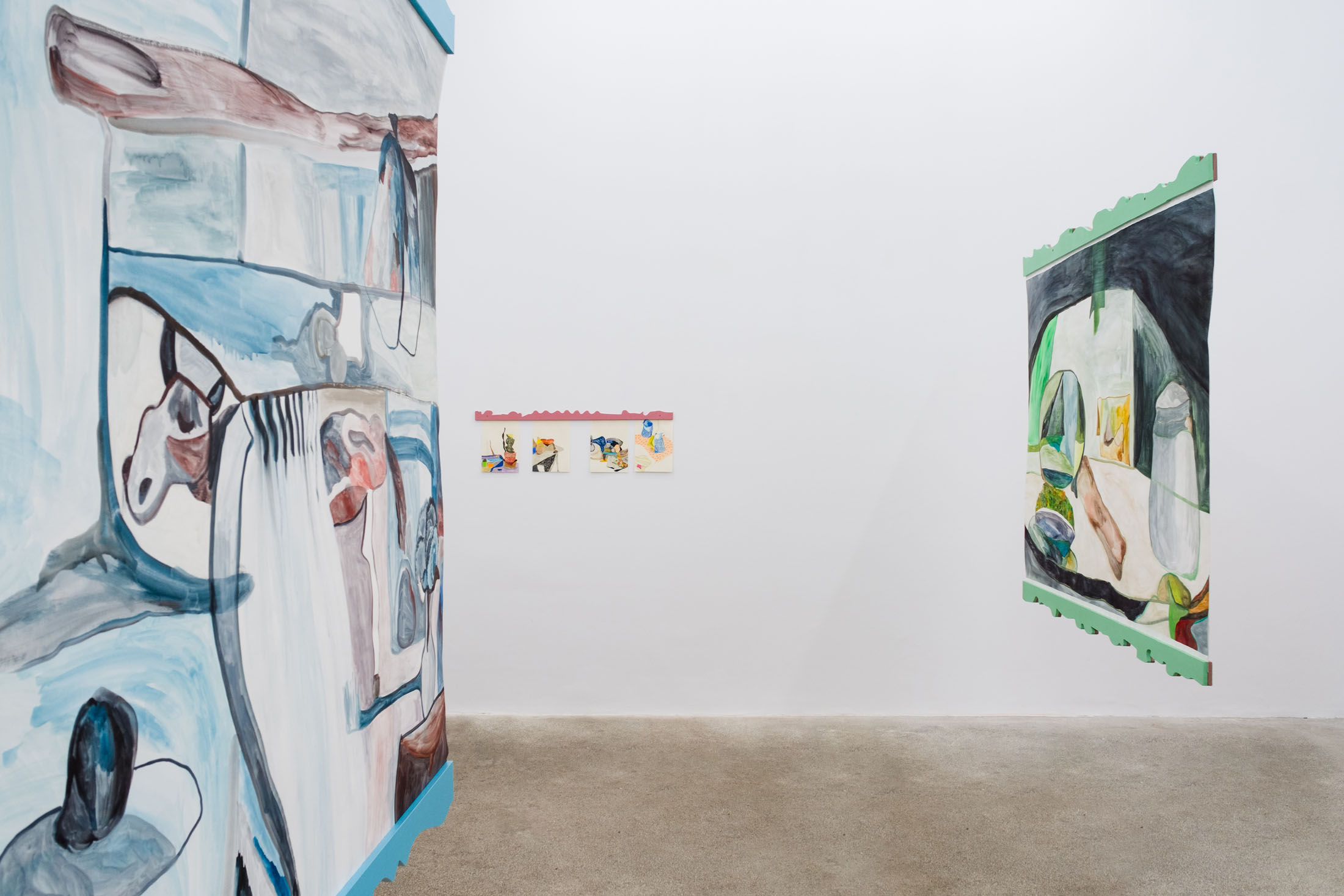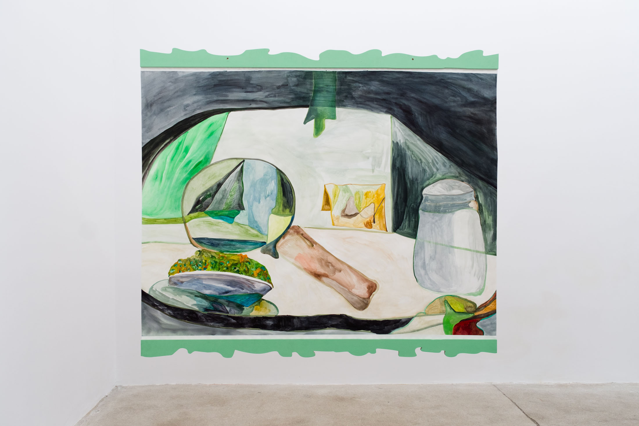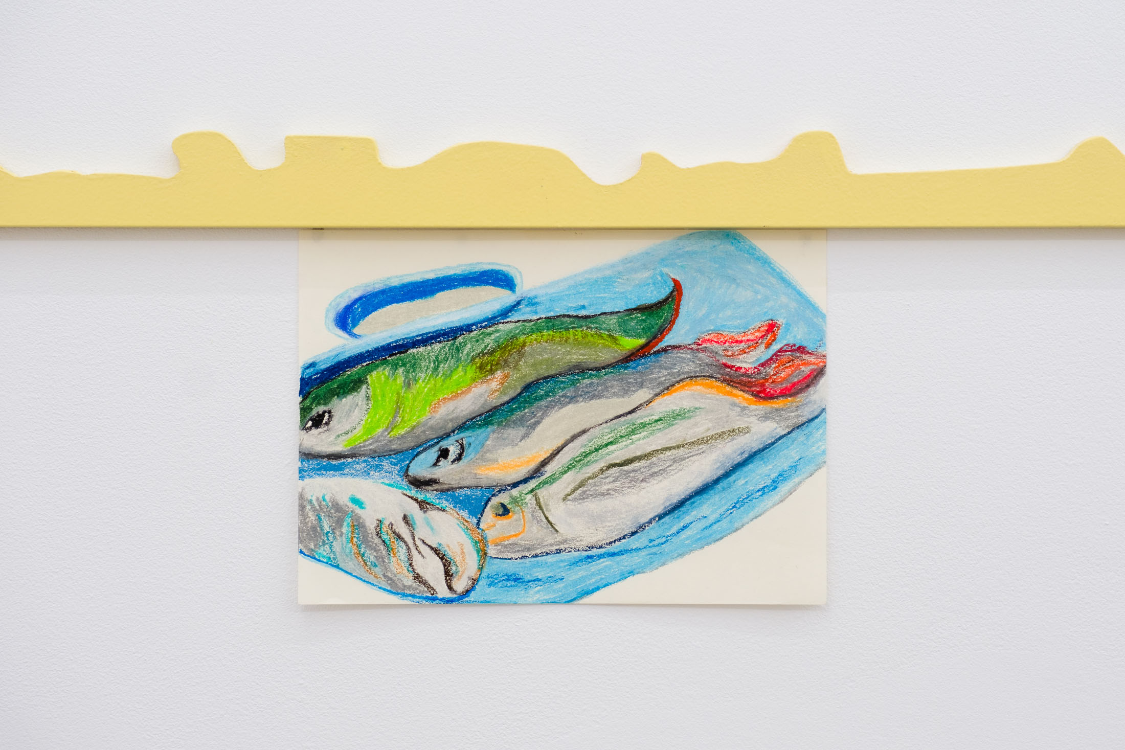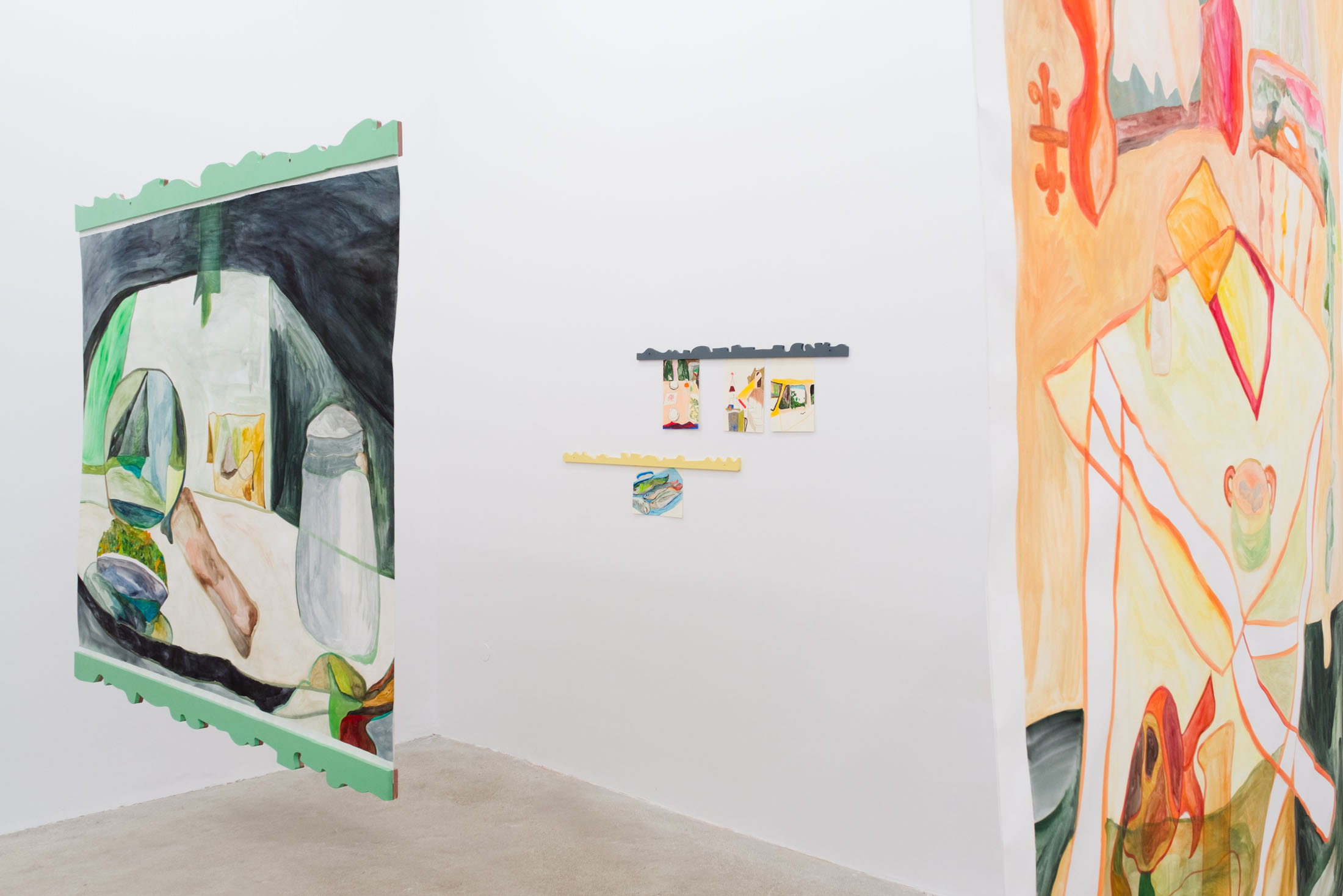 The works in A World Slightly Elsewhere are the outcome of recent explorations into the expressive potential of watercolor and oil pastel on paper, whose inherent and rather charming fragility augments the dynamic immediacy of the pieces. The encounter of these two registers of materiality—watercolor and pastel—one ethereal, the other velvety and unctuous, delineates the framework of a dialogue between the subtleties of evanescence and textural richness. The large-scale works are suspended, detached from the convention of the frame, offering themselves as vulnerable and imposing at the same time. They function as double gates—indeed, portals—granting access to a space-time of imagination, to a “land of mirrors” where everything resembles the known world but is governed by different rules, invented by an Alice who does not flee from reality but reconfigures it, exploring its folds and hidden possibilities.