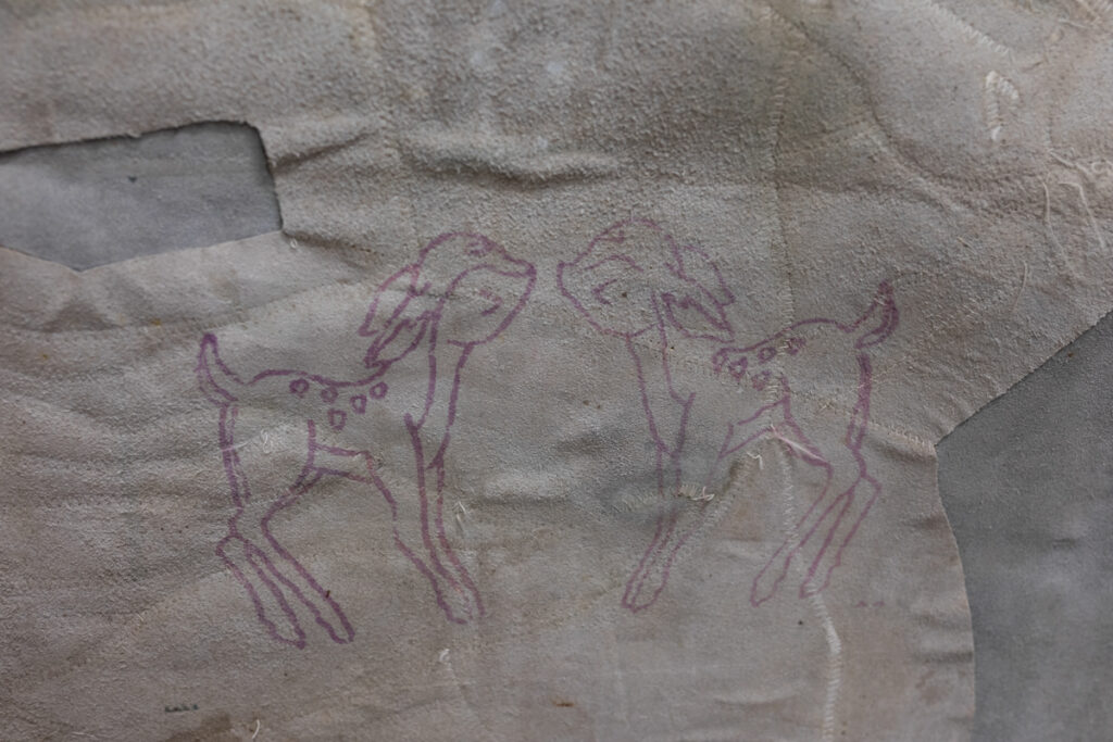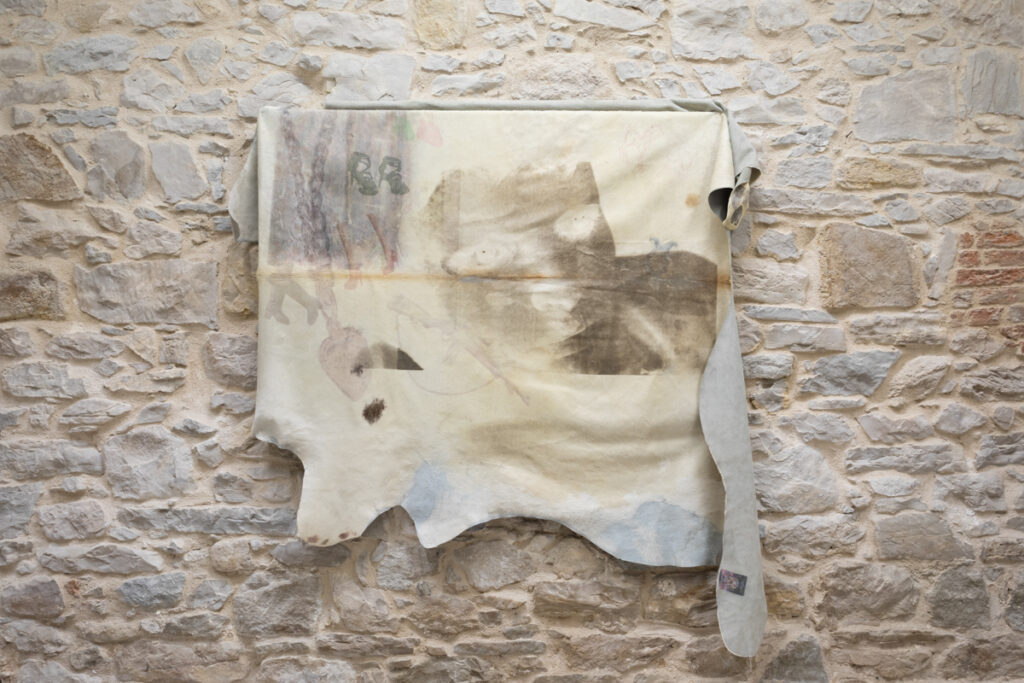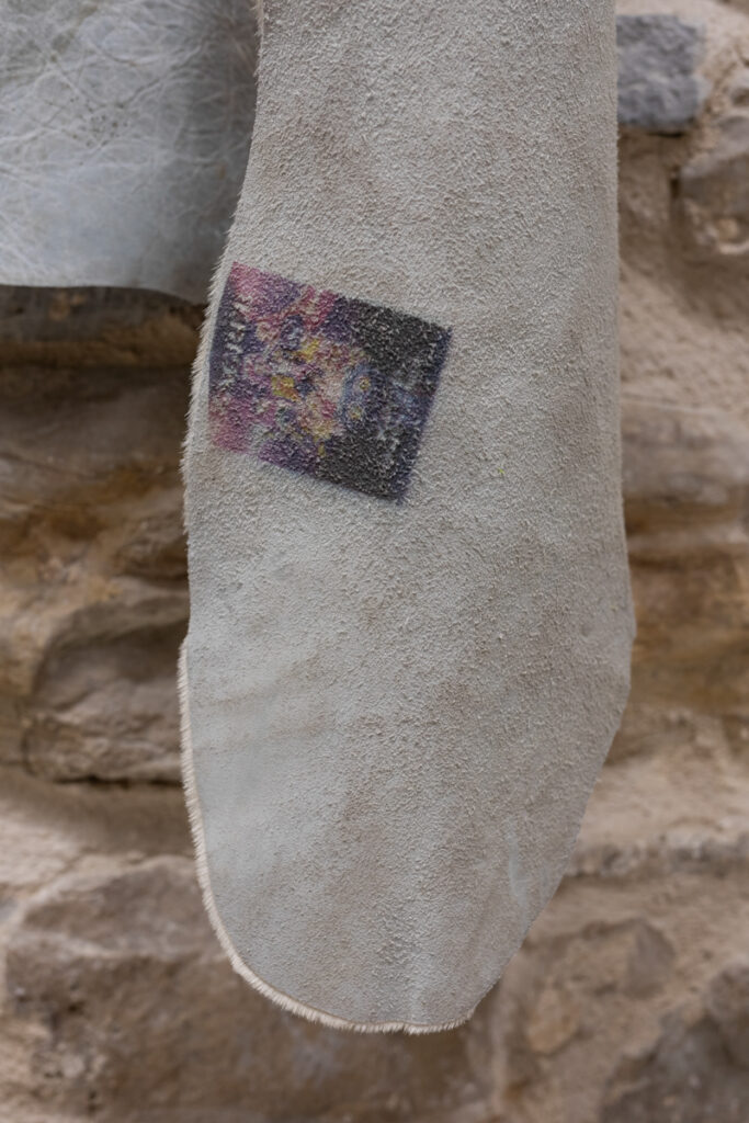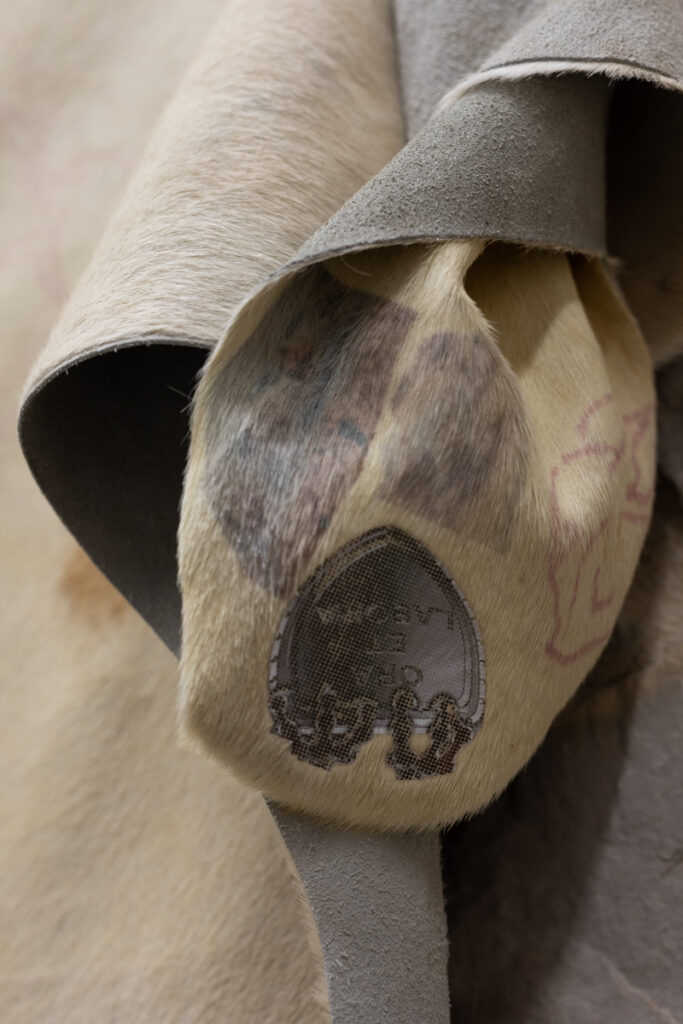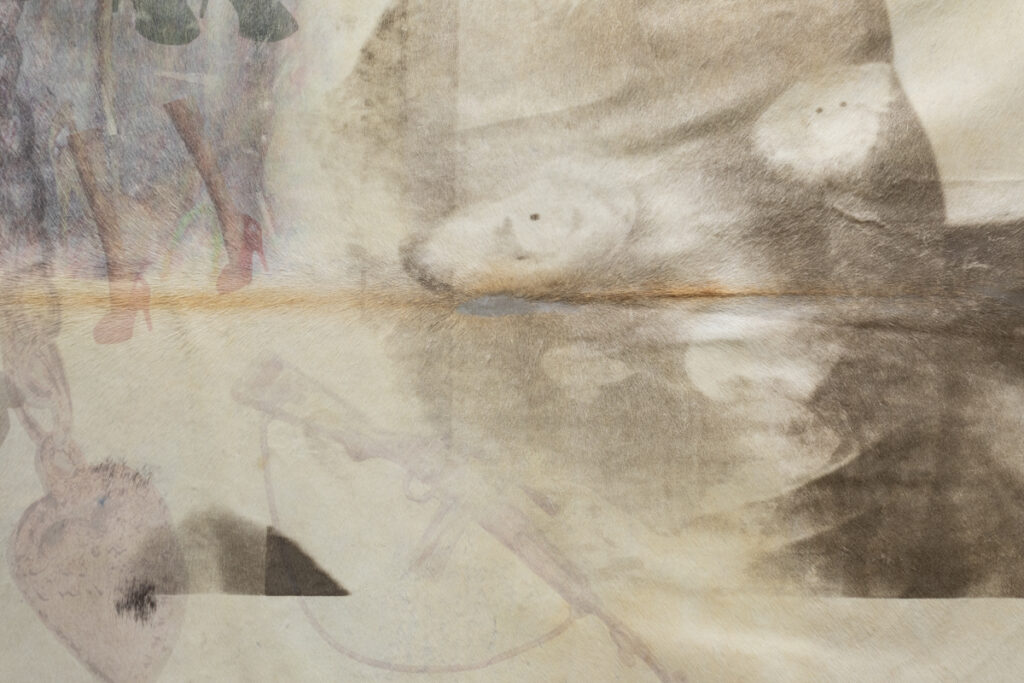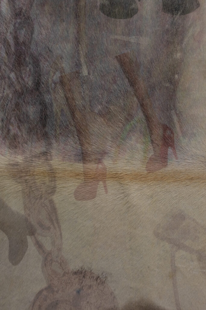 Discarded animal skin is used as a canvas that primarily carries images taken from online applications for selling clothing and objects, where those same images are likewise exchanged as commodities. Like flashes of memory, the images uncontrollably blend into one another, suggesting the coexistence of these photographic traces. The figure of a face stands out as the only seemingly living element of the composition. Eyes that seek a gaze establish communication and manipulate.