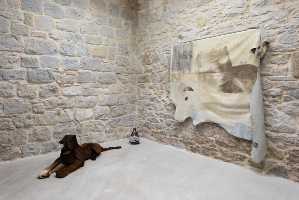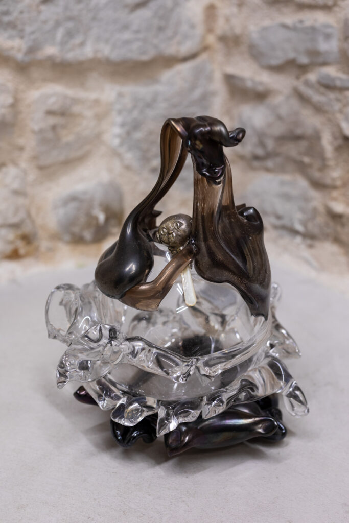 In the space, we are greeted by an animal presence resembling a plush tiger, crudely taxidermied with fragments of fur and skin. The tiger’s face and body disintegrate, and the eyes disappear. An unfinished entity fixed in the moment of its creation, on the threshold between the living and the nonliving, like a toy that no longer wishes to be one. We also notice a biomorphic glass form resembling a vase as it flows into the space, seeking a relationship with other organic elements of the estranged environment.