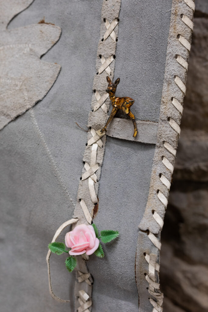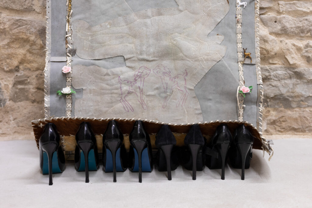 The exhibition Eyes without Face is based on in-depth research into materials that carry the potential for magical and ritual manifestation. Each carefully selected material encapsulates multiple past lives, initiating a process of further transmutation. Unique organic histories are layered collage-like to bring new possible biographies of hybrid entities to life. The presented materials are simultaneously recognized as intimate and familiar, but also unsettling elements of domestic interiors, children’s rooms, wardrobes, and drawers. Leather, fur, plastic, and glass surfaces now redefine the meaning of domestic space.
