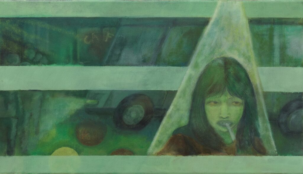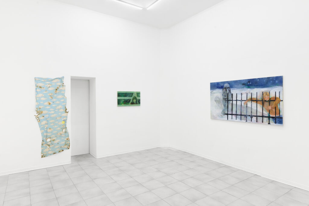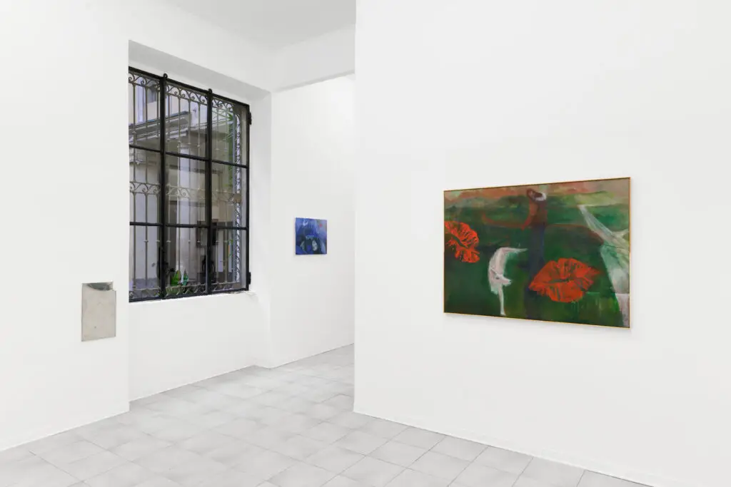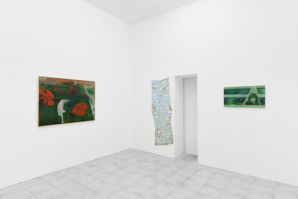 The titles, drawn from love song lyrics, further anchor the works in an affective and temporal register. A recurring element in this new series of Tobiášová’s paintings is the color green, often appearing as a luminous accent. Ambiguous in nature, it evokes both urban alienation—recalling the nocturnal glow of neon lights—and the surrealist tradition, particularly the Czech avant-garde. The artist references figures such as Toyen and Jindřich Štyrský, whose trajectories of emigration and artistic struggle resonate with her own experience and subtly permeate the work.