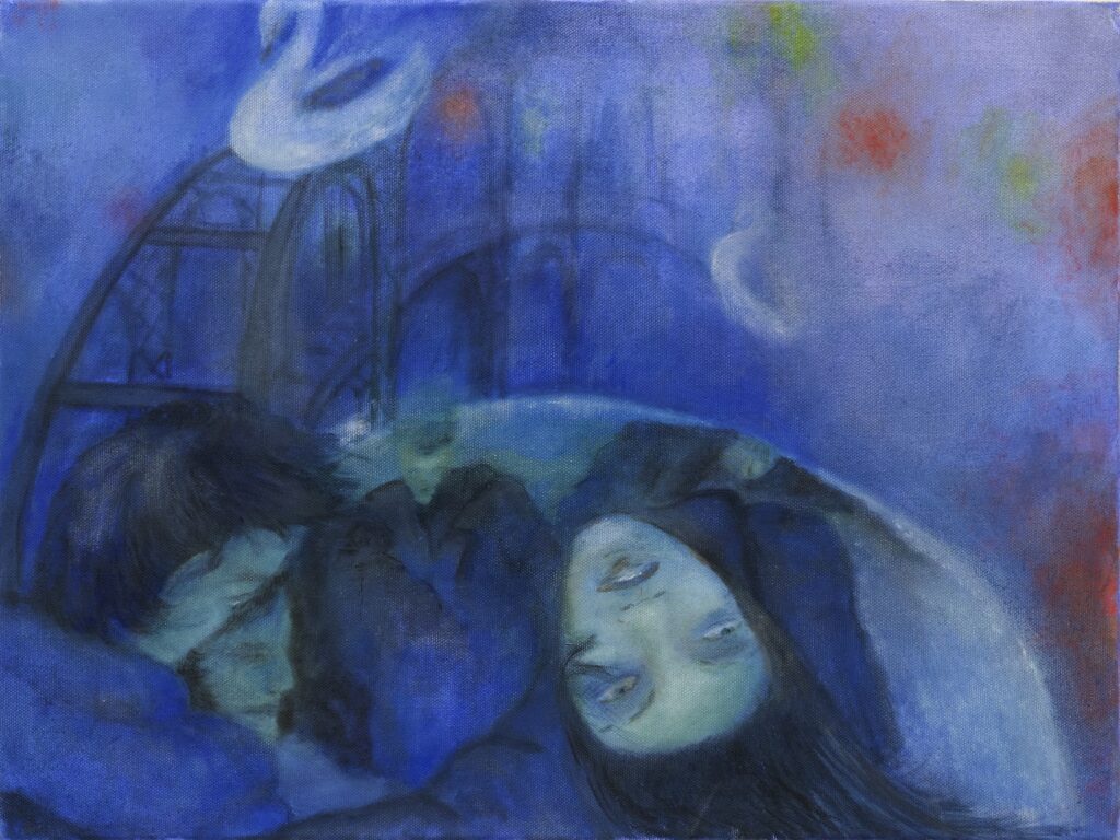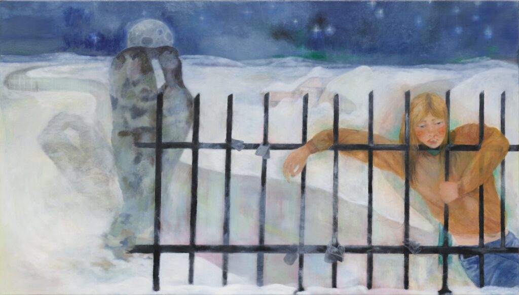 Sofie Tobiášová presents a body of predominantly horizontal paintings, developed through cycles of action and denial, decision and erasure. Her painterly process unfolds as a layered temporal space, where uncertainty, failure, and loss are embraced as necessary components of creation. The works employ deliberately kitsch or emotionally “awkward” imagery—adolescent love, loneliness, heartbreak, snowy landscapes, star-filled nights, romantic icons—to uncover their latent emotional and aesthetic potential. Adolescence becomes a central reference point: a phase marked by transition, vulnerability, and quiet shame, echoing the experience of migration and arrival in a new country. The recurring figure of the young girl embodies a threshold—no longer a child, not yet an adult—burdened with desire, expectation, and external projections. Rather than illustrating specific formative events, the paintings evoke the emotional atmosphere of that time: confusion, tenderness, longing, and clumsy attempts at love.